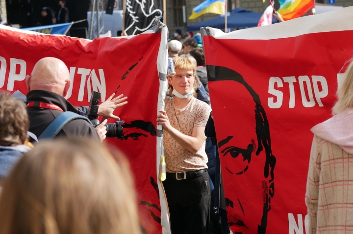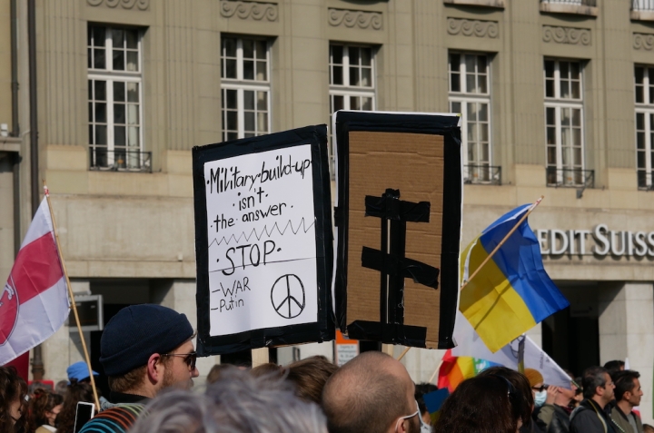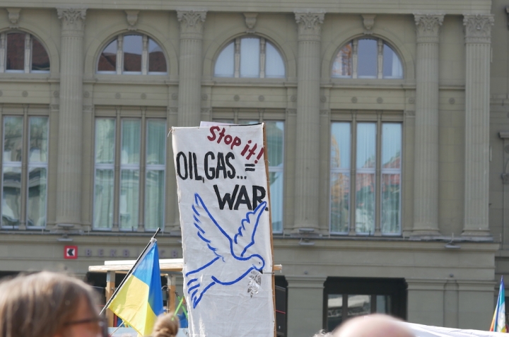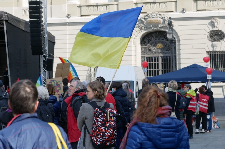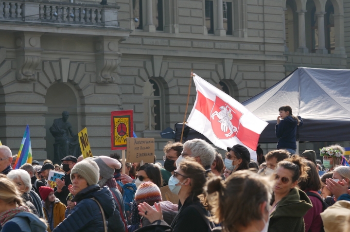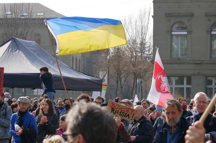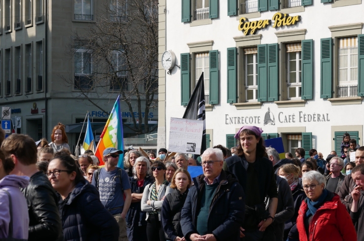 В субботу, 12 марта, в Берне несколько тысяч человек приняли участие в митинге за установление мира в Украине и за запрет импорта российского природного газа в Швейцарию. Протестующие прошли колонной от Schützenmatte до Федерального дворца. Многие несли в руках украинские флаги, радужные флаги мира, самодельных бумажных голубей и плакаты с критикой в адрес российского президента. Проведение акции было одобрено городскими властями. Нажмите на фото, чтобы увидеть его целиком. Фото – (с) Nashagazeta.ch; участники акции.