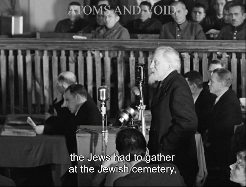 Une partie très importante du film est composée de témoignages enregistrés lors d’un procès à Kiev, en 1946. La salle est pleine à craquer. Étonnement, aucun des témoins ne verse une seule larme en racontant les horreurs vues et vécues. Mais le récit du professeur Artobolevsky qui décrit une vielle femme juive avec ses cheveux gris au vent, emmenée par les nazis, vaut une tragédie grecque.