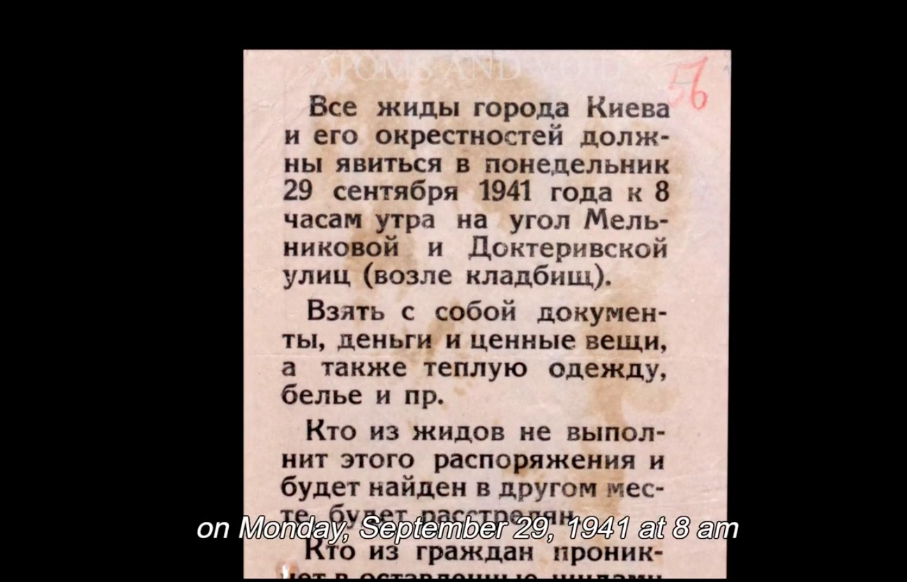 Un groupe des journalistes américaines visite Baby Yar en 1943, ils notent dans leurs cahiers que « de 50 à 80 000 des citoyens soviétiques ont trouvé ici leur mort ». Quelques minutes plus tard on entend un type à l’air très débrouillard qui parle de 100 000 morts et se plaint des « monstres fascistes » qui « nous ont obligés de construire les fours pour brûler les corps ». Le mot « juif » n’est plus prononcé. Il n’est plus d’usage.