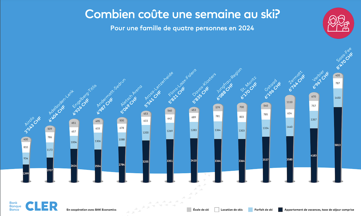 Во сколько же обойдется восьмидневный горнолыжный отдых для среднестатистической семьи из двух взрослых и двух детей 7 и 10 лет, включая семь ночевок, ски-пассы, туристический сбор, прокат лыж и обучение малышей? Cамым дорогим горнолыжным курортом для семейного отдыха оказался Саас-Фе, где, напомним, проходили съемки клипа «Last Christmas». Здесь семья заплатит за неделю каникул 8470 франков. Вербье, Церматт, Гштаад, Санкт-Мориц и регион Юнгфрау также относятся к одним из самых дорогих направлений: недельный горнолыжный отдых для родителей с двумя детьми будет стоить более шести тысяч франков. Разумеется, можно выбрать и более экономные места. В Айроло, например, можно будет покататься на лыжах за 3543 франка. Менее пяти тысяч франков будут стоить каникулы в Адельбоден-Ленке, Энгельберг-Титлисе и Андерматт-Зедруне. А вот курорты Алеч-Арена, Ароза-Ленцерхайде, Флимс-Лаакс-Фалера и Давос-Клостерс находятся в средней ценовой категории.