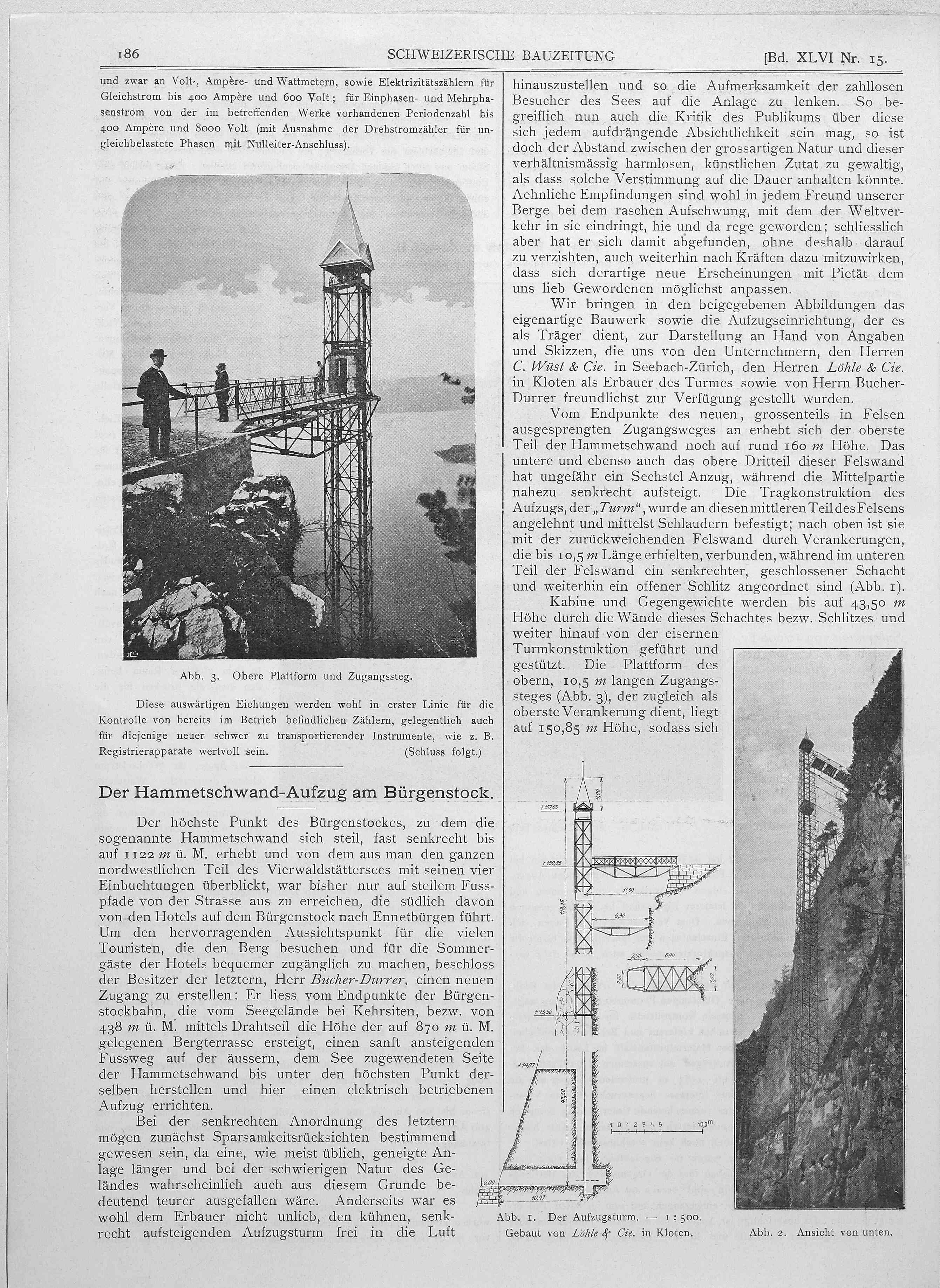 И всё же, при всей его романтичности, лифт – очень швейцарское сооружение. Его уникальная архитектура сводится к нескольким основным параметрам: инженерная мысль, уникальное расположение, необходимость и смело-хвастливое проявление обуздания человеком природы. В издании Schweizerische Bauzeitung за 1905 год уже говорилось: «Вертикальное расположение ... возможно, изначально было обусловлено экономией, поскольку наклонная система, как это обычно бывает, была бы длиннее и ... дороже. С другой стороны, строитель, вероятно, был не прочь разместить смелую, вертикально поднимающуюся в воздух подъемную башню и тем самым привлечь к установке внимание бесчисленных посетителей озера».