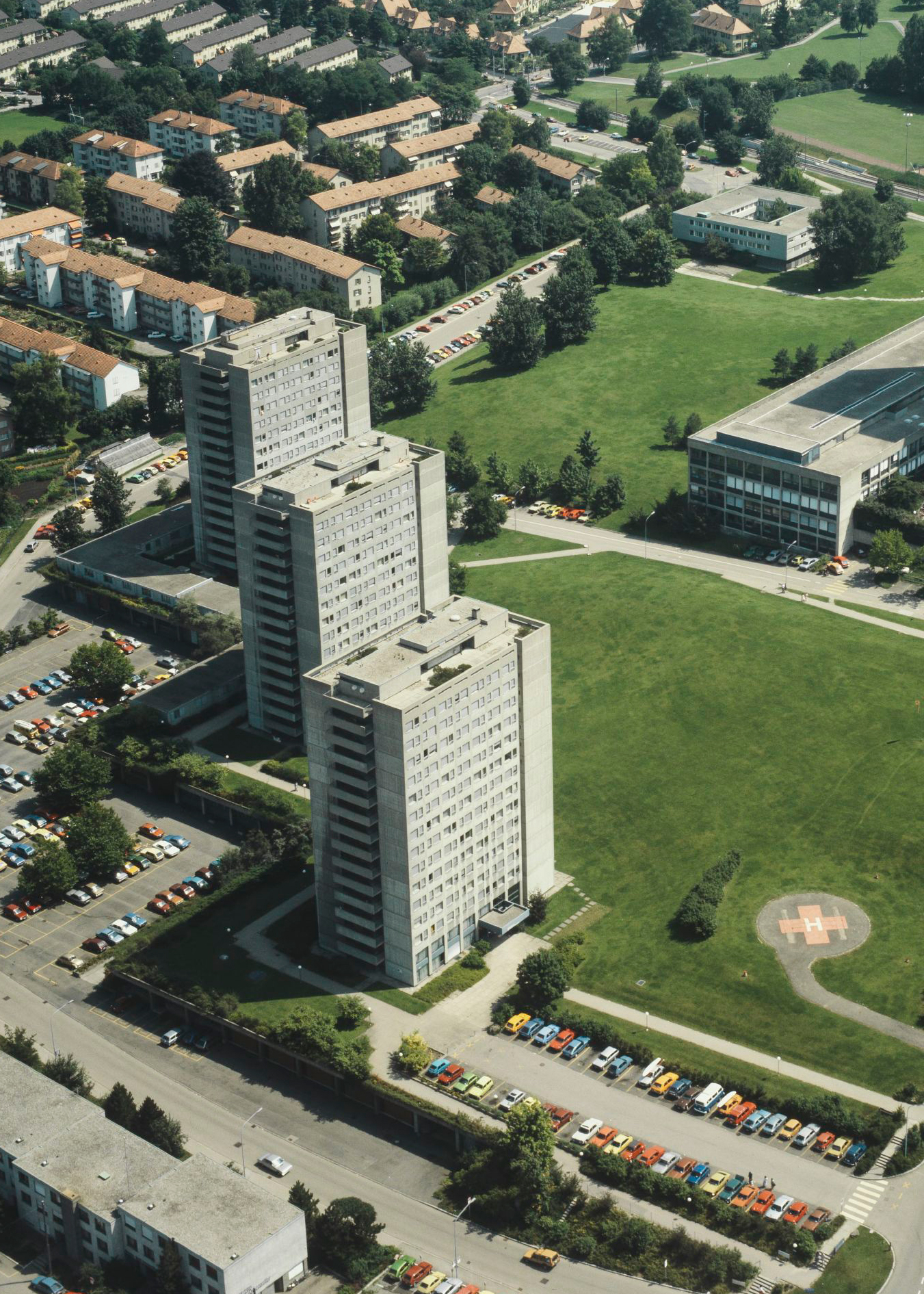 На периферии Цюриха находится огромный госпиталь «Тримли» (Stadtspital Triemli), окруженный большим количеством сопутствующих зданий, в том числе тремя бетонными жилыми башнями – старыми зданиями для персонала госпиталя. Они были построены в 1970-е годы и выглядят как типичные представители модернизма той эпохи: бруталистские одинаковые многоэтажки из необработанного бетона. Оно и понятно, ведь название стиля «брутализм» происходит от знаменитого выражения Ле Корбюзье «beton brut», то есть «необработанный бетон». Несмотря на архитектурную ясность и радикальность, брутализм как архитектурный стиль до сих пор не пользуется особой любовью у широкой публики. Созданные в нем здания, даже признанные шедевры мировой архитектуры, часто называют пугающими, страшными. Три башни в Тримли тоже красивыми не назовешь, да и планировки их, пятидесятилетней давности, оказалось очень сложно адаптировать к современным требованиям… В результате недавно городские власти Цюриха решили их снести.