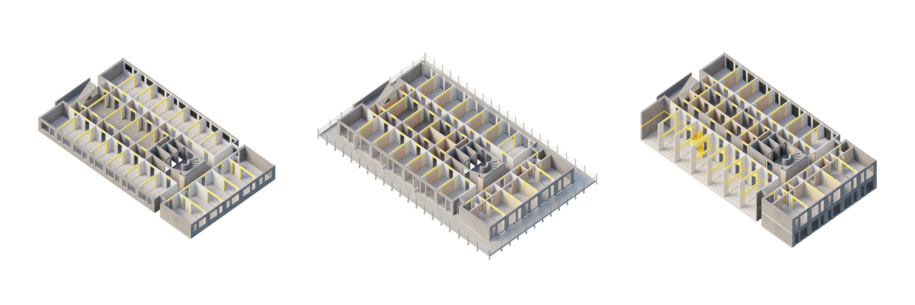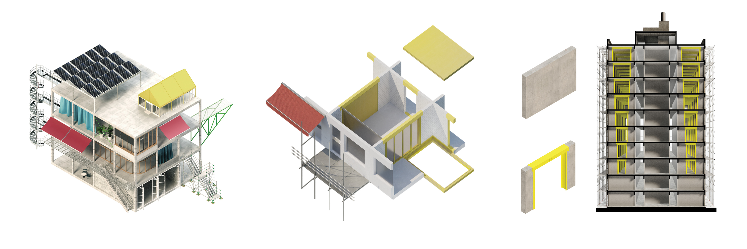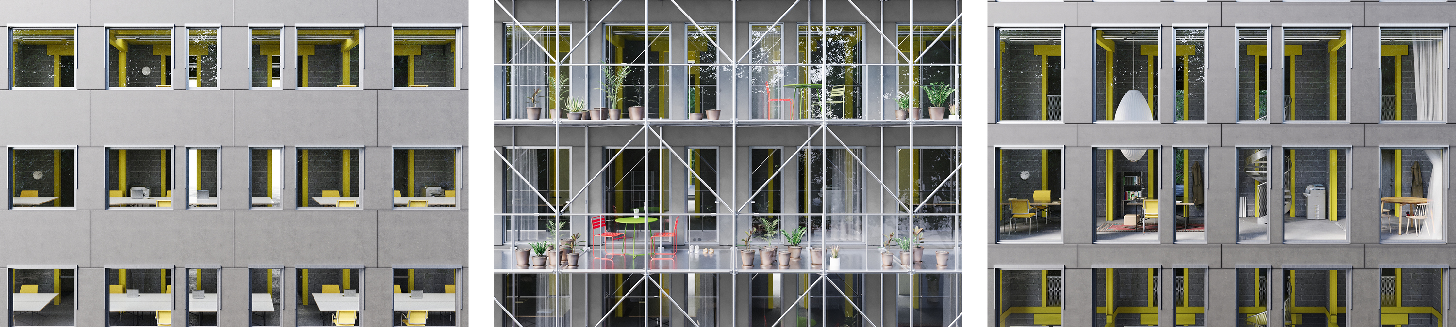 Все три башни Тримли очищаются до единого каркаса «хардвер», идеально приспособленного для дальнейших трансформаций. Для трёх башен разрабатываются три временных сценария: 1) Башня – дни, 2) Башня – месяцы, 3) Башня – годы. Эти временные периоды обозначают разные уровни сложности, с которой башни могут претерпевать изменения. В башне «Дни» меняется совсем немногое, и изменения функции здания производятся за счёт мебели и легкоподвижных элементов интерьера. К башне «Месяцы» добавлены временные галереи из строительных лесов, позволяющие входить в здание на любом этаже с любой стороны, таким образом «освобождая» планировку, а для членения пространства используются легковозводимые перегородки. В башне «Годы» произведены наиболее радикальные изменения: здесь появляется возможность частичного удаления межэтажных перекрытий, что позволяет зданию вмещать в себя не только жилые, но и общественные функции, требующие высоких перекрытий.