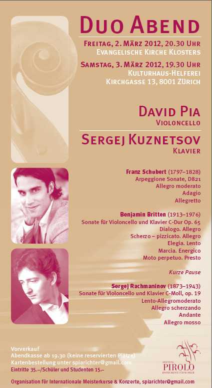 3 марта любителей классической музыки ожидает интересный вечер. В цюрихской «Helferei» (Кирхгассе, 13) в 19:30 состоится концерт Давида Пиа (виолончель) и Сергея Кузнецова (фортепиано). Дуэт молодых музыкантов исполнит программу из произведений Франца Шуберта, Бенджамина Бриттена и Сергея Рахманинова.