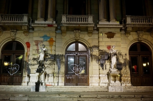 Беспорядки в Женеве и граффити на фасаде Большого театра | Manifestation sauvage à Genève et des tags sur la façade du Grand Théâtre