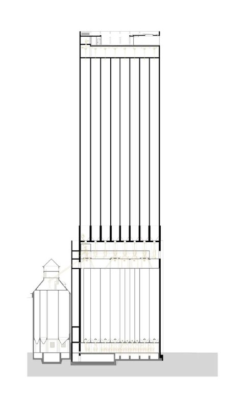 Удивительно, что столь радикальное здание по факту является надстройкой к ранее существовавшему. На фасад современного Зернового небоскреба нанесены красные полосы: это не только конструктивные элементы (контрфорсы, выражаясь архитектурным языком), но и отметка той высоты и объёма, которые занимало предыдущее здание. Удивительно трогательная деталь: с одной стороны, со «снесённым» (точнее было бы сказать «поглощённым») зданием не особо церемонились, заменив его на новое. В то же время, на фасаде с помощью самых простых средств отмечены исторические объёмы предыдущего здания. С рекивидно, что эти красные полоски «невидимого» здания продолжают высоту и ритм единого фасада исторических промышленных домиков, стоявших здесь изначально, и соотносятся с ними по цвету.