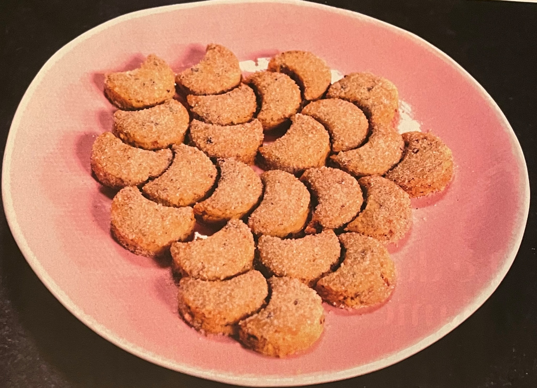 Приготовление: натереть холодное масло и добавить остальные ингредиенты. Перемешать до получения однородного теста, раскатать до толщины 1 см, нарезать в виде полумесяцев. Выпекать при температуре 180 градусов около 12 минут до того, как печенье приобретет золотистый цвет. Обвалять горячее печенье в смеси ванили и сахара.