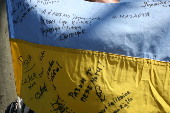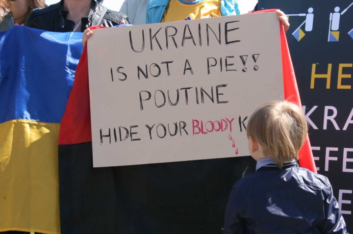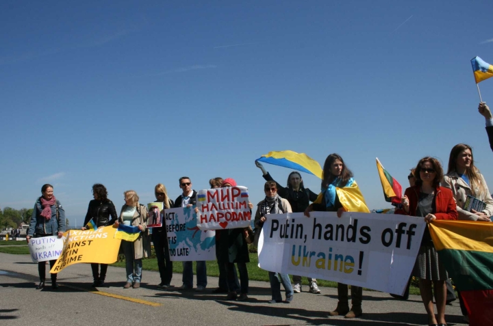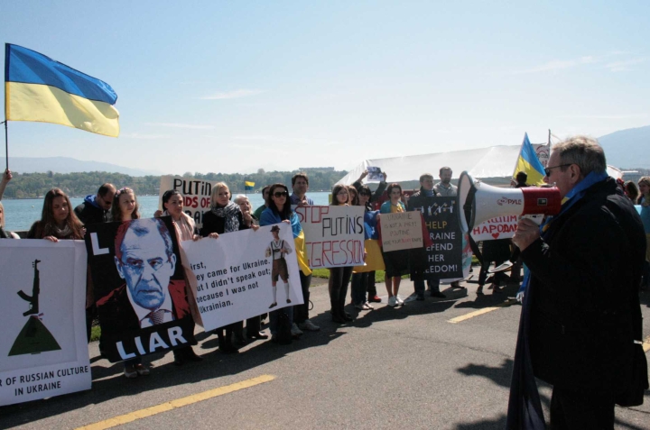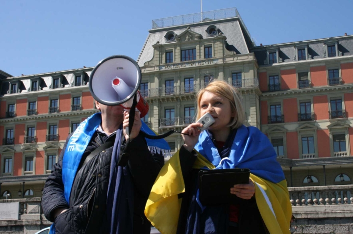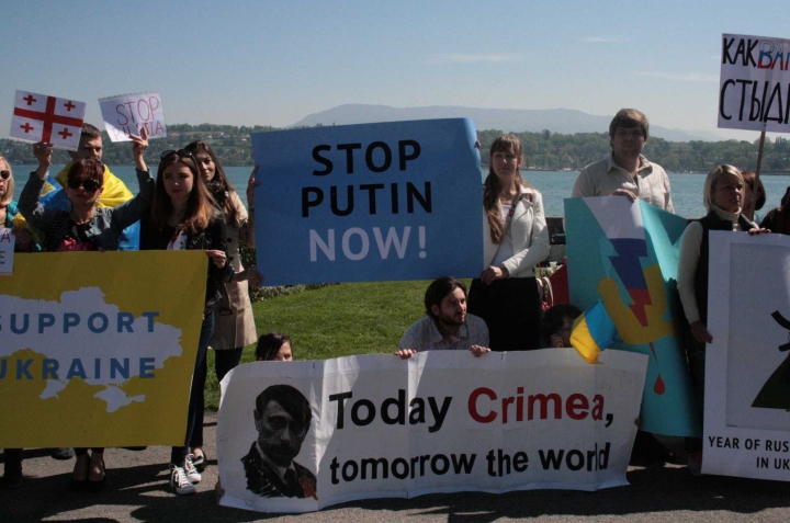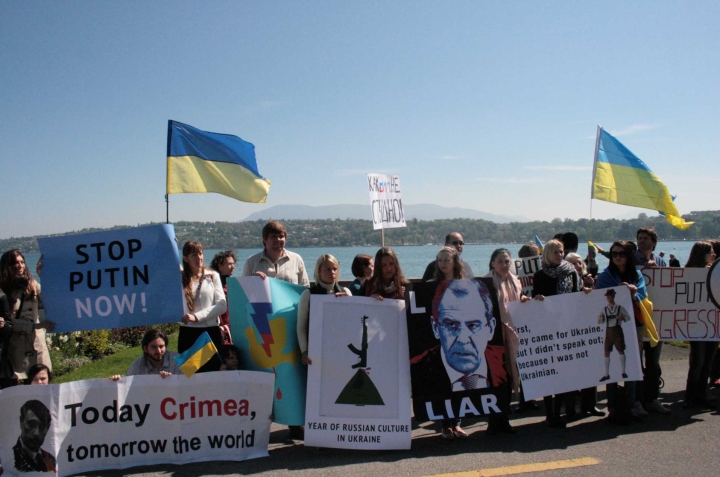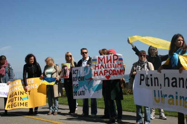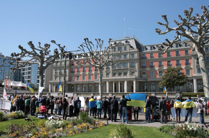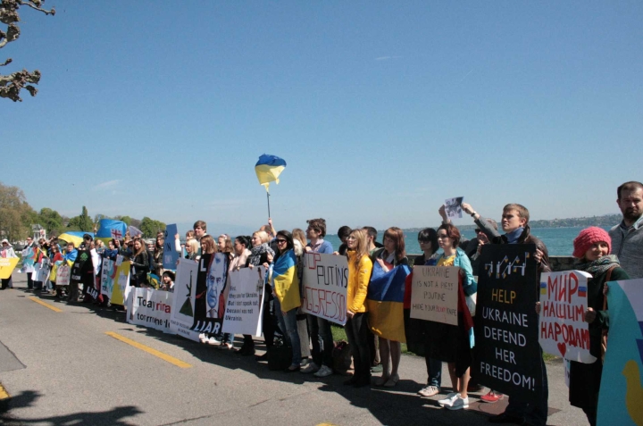 17 апреля напротив Дворца Вильсона в Женеве прошел митинг, организованный украинцами, живущими в Швейцарии. Предложение о проведении манифестации было распространено через социальные сети. По предварительным оценкам, перед зданием бывшей штаб-квартиры Лиги Наций собралось около 50 человек. Главное требование, выдвинутое участниками митинга, было озвучено на английском – «Stop Russian Aggression».