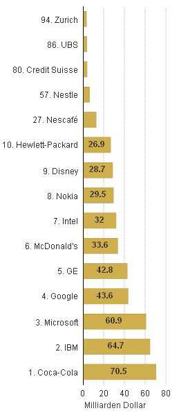 Первые места в списке заняты американцами. Лидером, как и прежде, остается  Coca-Cola, рыночная стоимость предприятия, производящего этот напиток, составляет 70,45 млрд. долларов. На втором и третьем местах находятся, как и в прошлые годы, американские производители компьютеров IBM и Microsoft. Затем следует поисковый интернет-гигант Google, который несколько лет подряд передвигался по по этому списку, в 2008 году будучи на 20 месте, в 2009-м – на 10 месте, и наконец, в 2010 году достиг четвертой позиции (рыночная стоимость Google 43,56 мдрд. долларов).