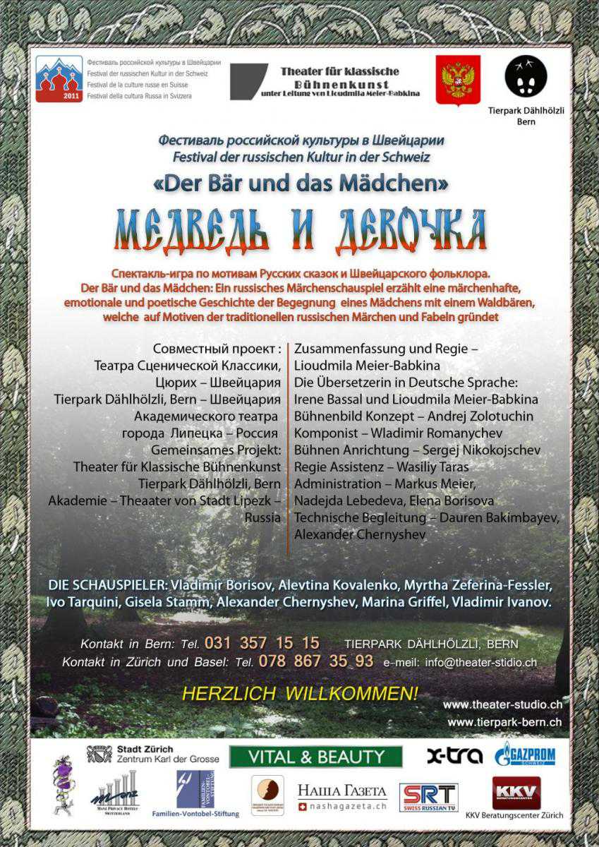 Тогда же, в июне, мэр Берна Александр Шаппет объявил собравшимся о том, что 9, 10 и 11 сентября 2011 года на территории зоопарка, то есть в непосредственной близости от нового места обитания мохнатиков, состоится спектакль Театра Сценической Классики, посвящённый медвежьей теме. И артисты мэра не подвели.