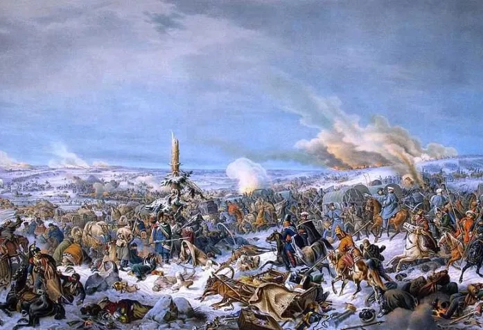 «Великая армия» Наполеона отступала к русской границе. Она спешила переправиться через реку Березина, чтобы спасти оставшихся солдат. Французы смогли оторваться от основных войск Кутузова, но были вынуждены сражаться с армиями полководцев Чичагова и Витгенштейна на обоих берегах реки. По реке шириной в сотню метров плыли льдины, мешавшие стоящим по плечи в воде французам наводить понтонные мосты (по свидетельствам очевидцев, все они потом погибли от холода). Переправа воинских команд, артиллерии, снаряжения, отрядов небоеспособных солдат и гражданских с обозами длилась много часов, в это время вокруг шли бои. На самой переправе нашли смерть тысячи раненых и обмороженных французов. Кутузов в донесении царю оценивал потери врага в 29 тысяч человек. Впрочем, русские жалели упущенный шанс полностью уничтожить Наполеона, возлагая вину за это на адмирала Чичагова, неправильно выбравшего лагерь для солдат.