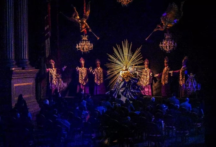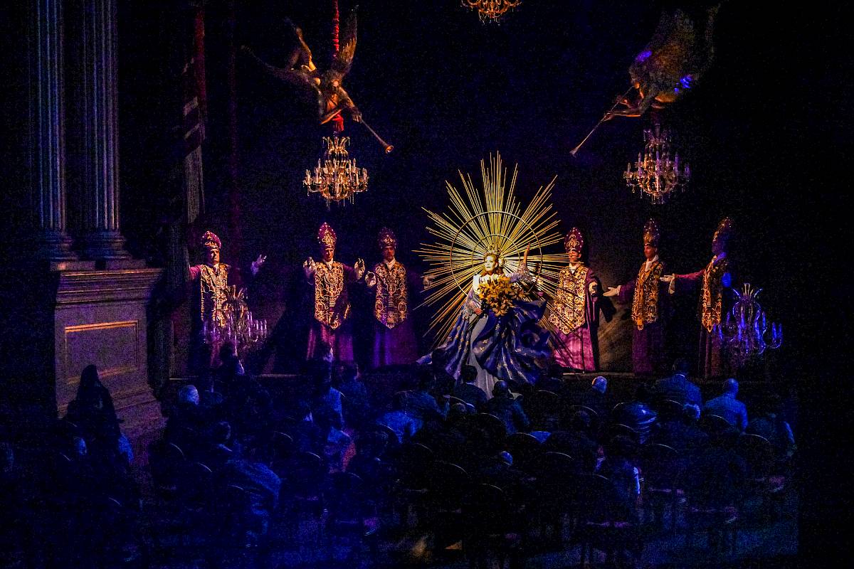 Аналогичная ситуация в постановке «Тоски», сценографическое решение которой нам очень понравилось. С левой стороны сцены – часовня, на стене которой Марио Каварадосси пишет портрет красавицы, вызвавший ревность его возлюбленной, справа – закрытый театральный занавес, намекающий на присутствие за ним сцены: Флория Тоска – певица. Так на сцене объединены миры главных героев, а зрительские кресла посередине, «подходящие» и для церкви, и для театра, напоминают, что вся наша жизнь – театр! Просто, ненавязчиво, элегантно. По законам жанра, согласно которым присутствующее на сцене ружье обязательно должно выстрелить, закрытый занавес на сцене должен был открыться. И он открылся, предъявив взорам восхищенных зрителей зал, где священнослужители в роскошных одеяниях прославляют восседающую на троне-алтаре Флорию Тоску, олицетворение Любви.