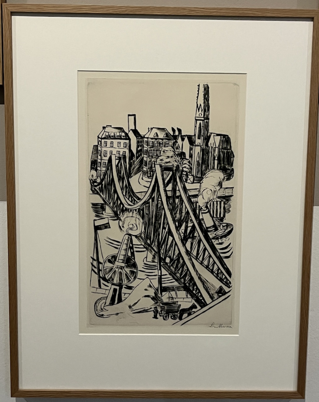 Используя эту технику, художник прямо царапает металл острой иглой, без кислот. За счёт заусенцев металла линии получаются более бархатистые, «лохматые», и именно эта «лохматость» неожиданно роднит Рембранда и Макса Бекманна с его «Большим мостом», перекинутым через поколения в 1922 году.