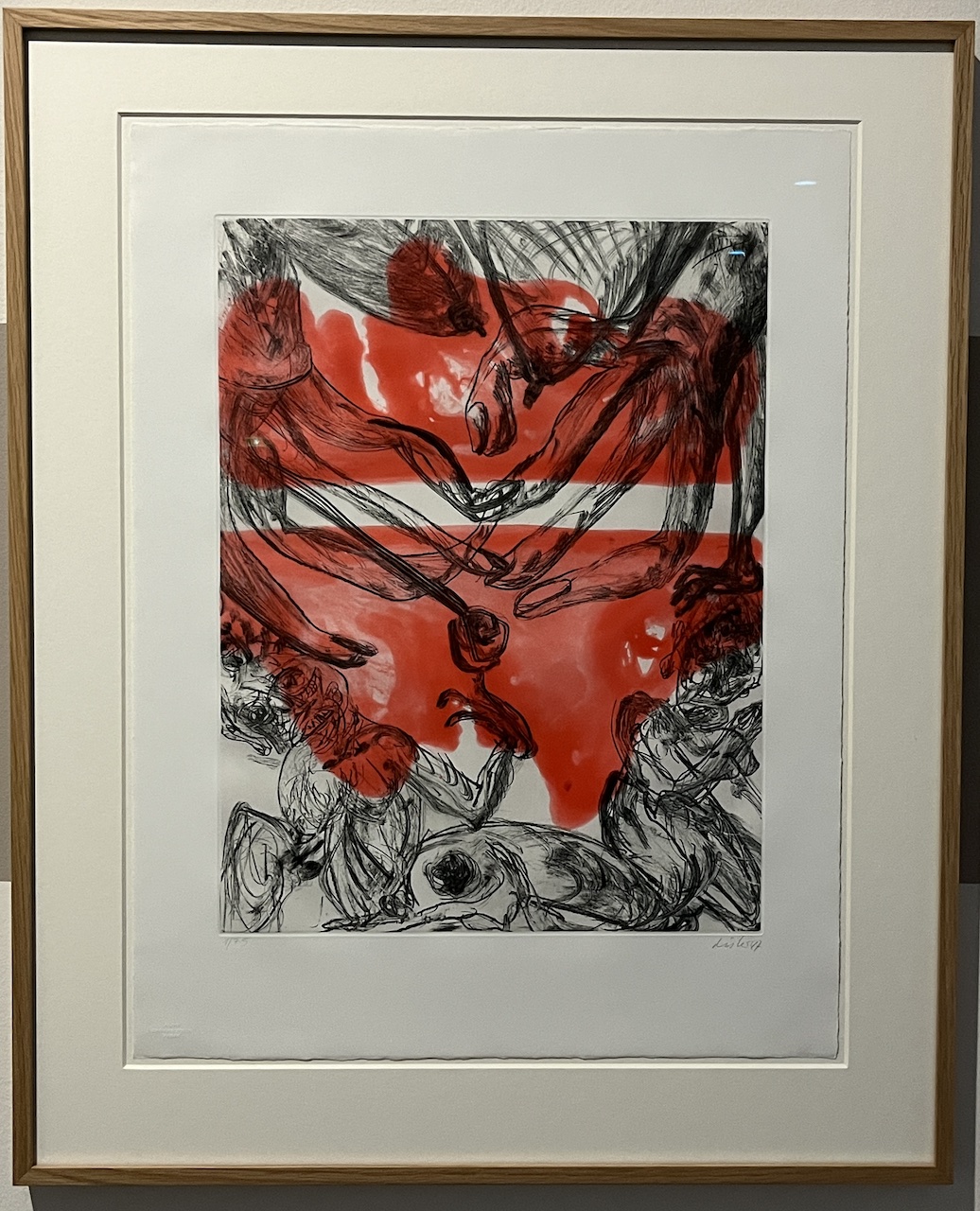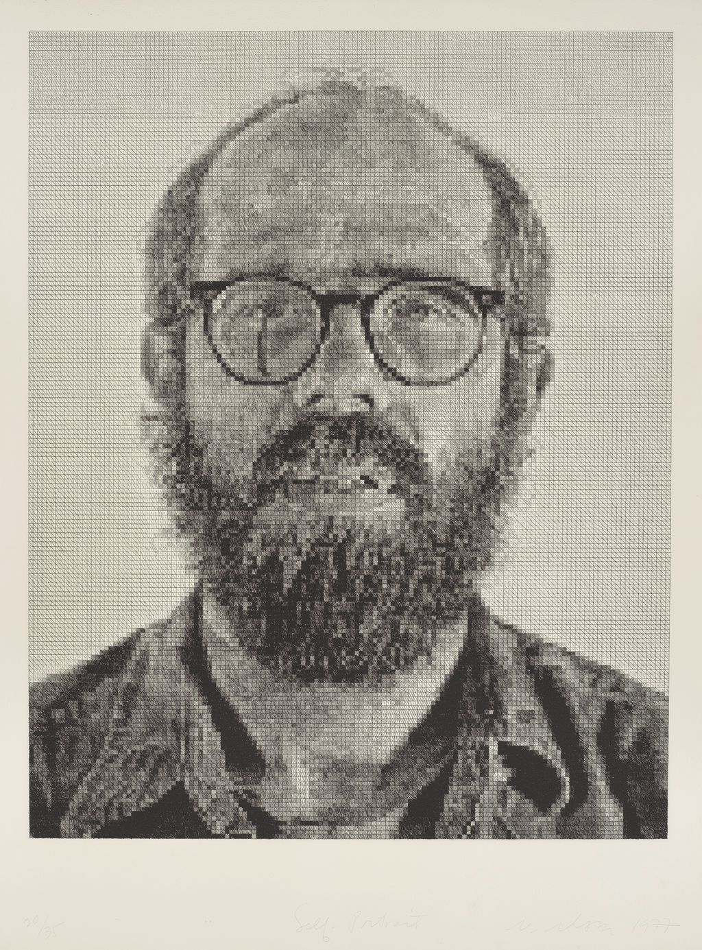 Если очень кратко, то для создания офорта пластину покрывают кислотоустойчивым лаком, художник царапает рисунок, а потом всё травят кислотой. В результате линии выходят более свободные, живые, словно нарисованные пером. Многосторонний Альбрехт Дюрер пользовался и этой техникой, о чем свидетельствует его работа «Судариум, который держат два ангела» 1516 года. Веком позже к ней прибегал Рембрандт, двумя веками – Пиранези и Каналетто, тремя – Эдуард Мане, а в 20 веке техника эта, похоже, вообще была в моде, достаточно посмотреть на работы Пауля Клее, Дитера Рота, хорошо известного нашим читателям Маркуса Раеца, Верены Лёвенсберг, Жюли Мерету или на уже упоминавшийся громадный «Автопортрет» Чака Клоуза 1977 года создания, открывающий эту часть экспозиции.