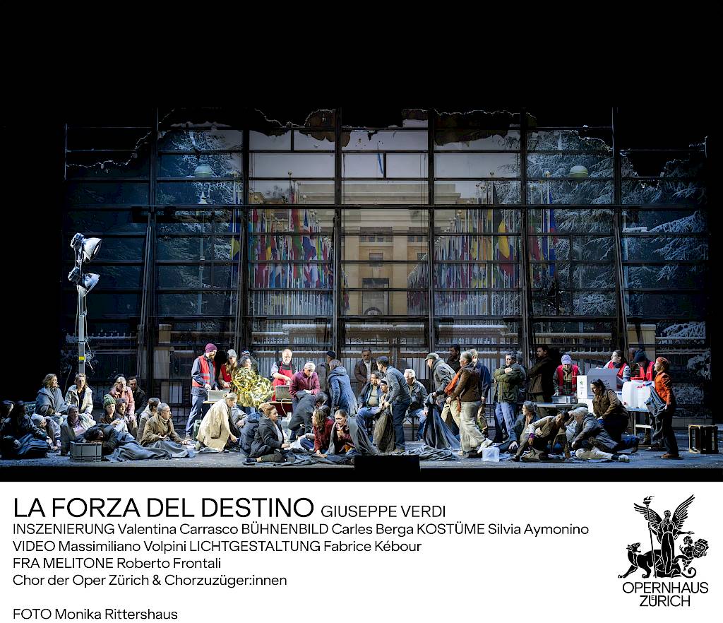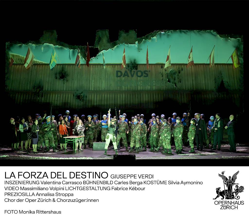Автор постановки, аргентинский режиссер Валентина Карраско, с 2000 по 2020 годсотрудничала с каталанской театральной труппой La Fura dels Baus, известной своими неожиданными сценографиями и стиранием границ между артистами и публикой, и принимала участие в многочисленных оперных постановках – в частности, в постановке «Дон Жуана» Моцарта в Перми и «Алеко» и «Франчески да Римини» Рахманинова в Киле. В коротком интервью, размещенном на сайте Оперного театра Цюриха, Валентина Карраско объясняет, что главное для нее в «Силе судьбы» – постоянное присутствие войны в судьбах главных персонажей. Режиссер не преувеличила: война действительно присутствует постоянно, даже когда, согласно либретто, ее на сцене быть не должно. Так, в сцене прихода Леоноры в монастырь ей не только обстригают волосы, но делают татуировку на руке, надевают бронежилет и вручают автомат. Возможно, часть публики сочла это перебором, чем можно объяснить отчетливое «Бу-у-у», раздавшееся в зале, когда на финальные поклоны в конце спектакля вышла именно постановочная группа; всех солистов, не в равной степени этого заслуживших, а также хор и дирижера Джанандреа Носеду встречали бурными аплодисментами, перешедшими в овацию.