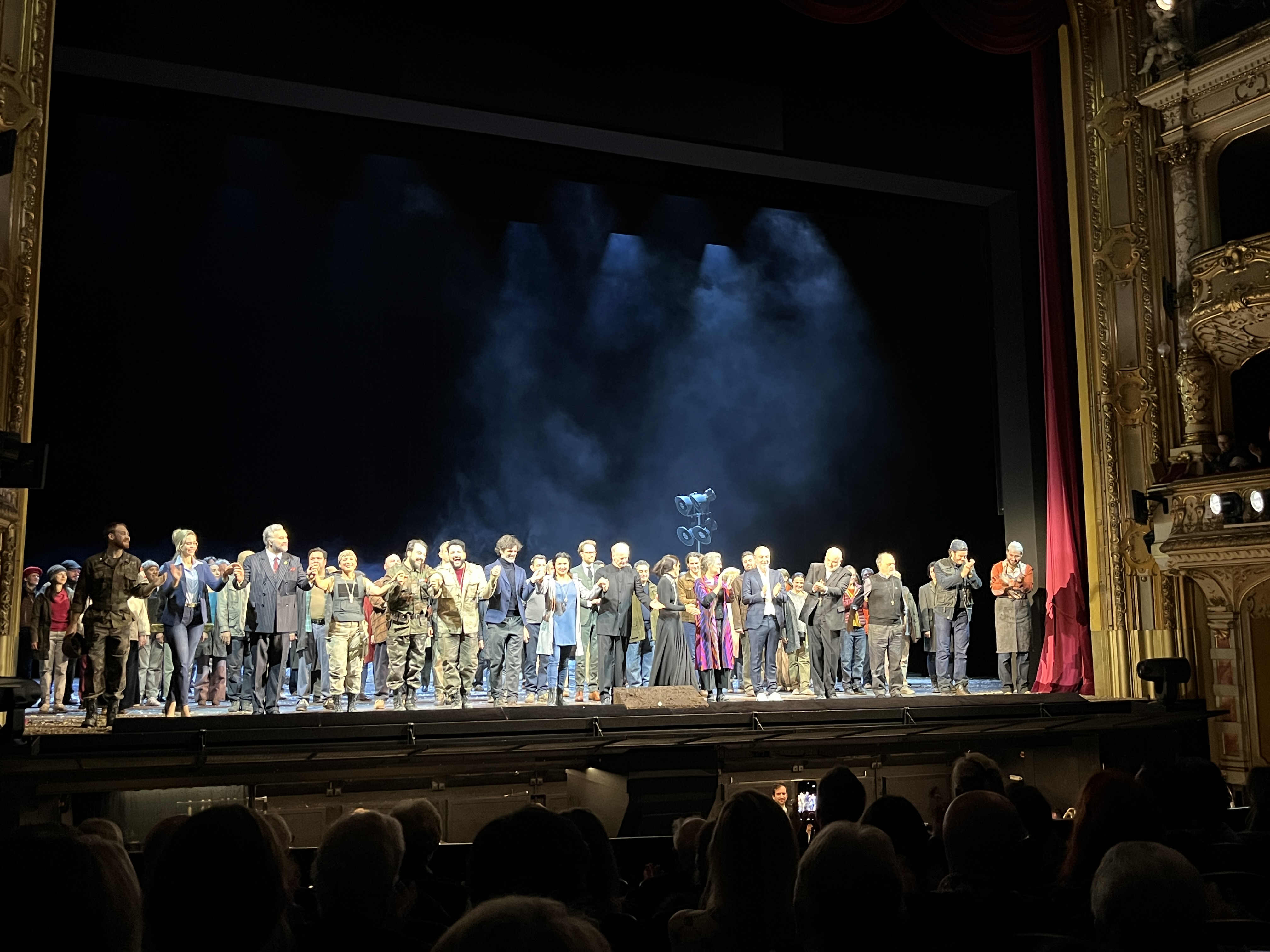Но редко на войне наживаются солдаты, гораздо чаще – некоторые политики и торговцы оружием, которых мы видим в сцене «Конгресс в Давосе» (видно, слово «конгресс» заменило в спектакле «форум» из соображений авторских прав, но все и так понятно). Был бы смешон, если бы не был так печально узнаваем Фра Мелитон (великолепен очень артистичный итальянский баритон Роберто Фронтали), от имени Красного Креста разливающий суп беженцам, которые порядком ему надоели.