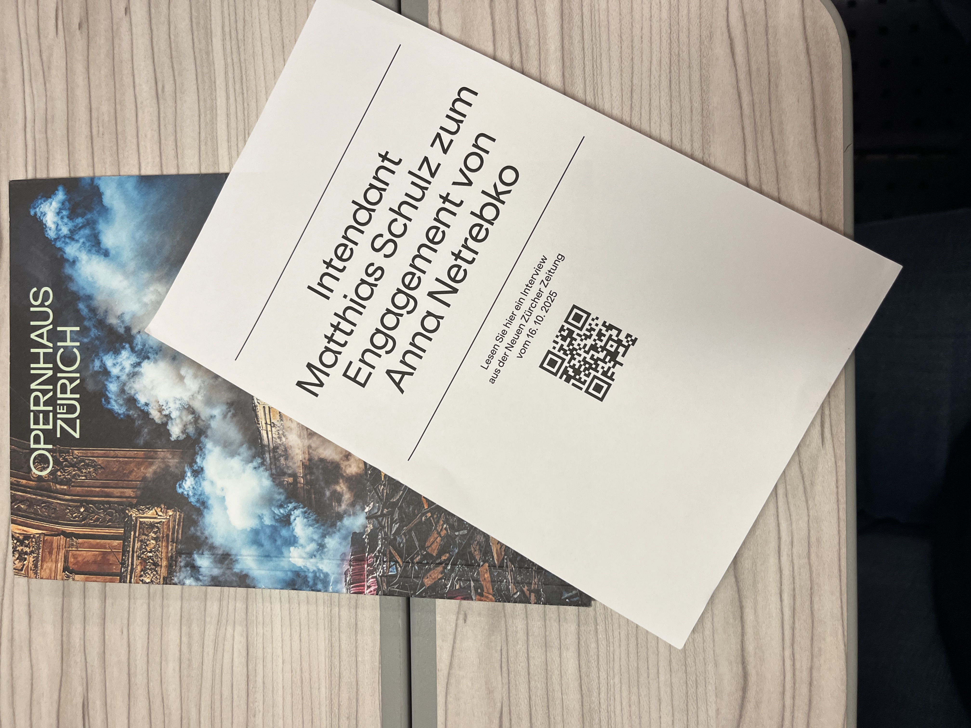… Не будем сейчас рассуждать о юридической и моральной легитимности всех этих судей, любителей покидать камни, но вот с таким информационно-эмоциональным багажом мы отправились на премьеру «Силы судьбы» в Цюрих. Перед входом в театр нас встретили человек 15-20 с украинскими флагами, сообщавшие проходящим мимо них зрителям, что «Анна Нетребко – орудие Кремля». В программу спектакля был вложен листок с QR-кодом, благодаря которому каждый желающий мог ознакомиться с позицией интенданта театра по вопросу приглашения российской певицы. Никаких особых мер безопасности мы не заметили.