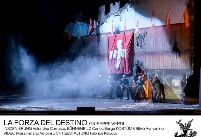 Взявшись за «Силу судьбы» в Цюрихе, Валентина Карраско решилась на по-своему интересный и даже дерзкий шаг – перенести действие не просто в какую-то условную страну, охваченную войной, а конкретно в нейтральную Швейцарию. На фоне великолепной увертюры с ее знаменитой темой фатума зритель видит на гигантском экране карту Швейцарии с как бы просвечивающей сквозь нее ночной, плохо освещенной дорогой, вдоль которой – разрушенные дома. Куда ведет эта дорога? Она ведет на войну.