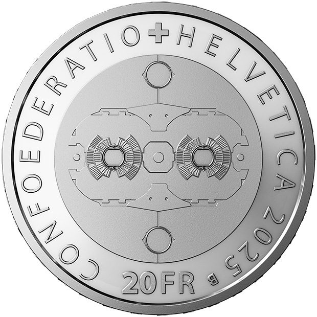 В центре реверса изображено сечение сверхпроводящего магнита. Надпись «CONFOEDERATIO HELVETICA 2025» окружает дизайн, оставляя место для номинала 20 франков в нижней части монеты. Внешнюю границу завершает скромная буква «B», напоминающая о месте изготовления монеты: Берн.