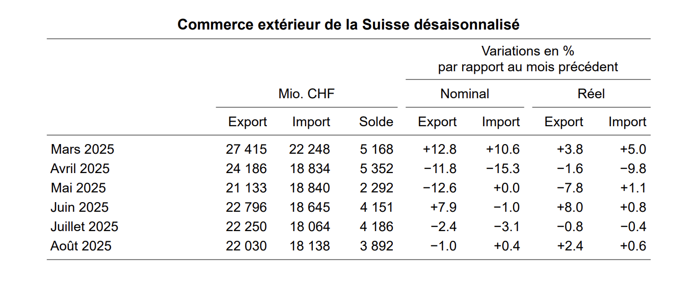 Начнем с конца, то есть с делаемого в официальном коммюнике вывода. После спада в предыдущем месяце, в августе 2025 года сезонно скорректированный экспорт также сократился (–1,0%). Если с географической точки зрения на результат повлиял экспорт в США (оборот с США упал на пятую часть, или на 873 млн франков), то с точки зрения товарных групп особенно пострадали продажи часов. Импорт немного вырос (+0,4%). В итоге торговый баланс показал профицит, не превышающий 3,9 млрд франков.