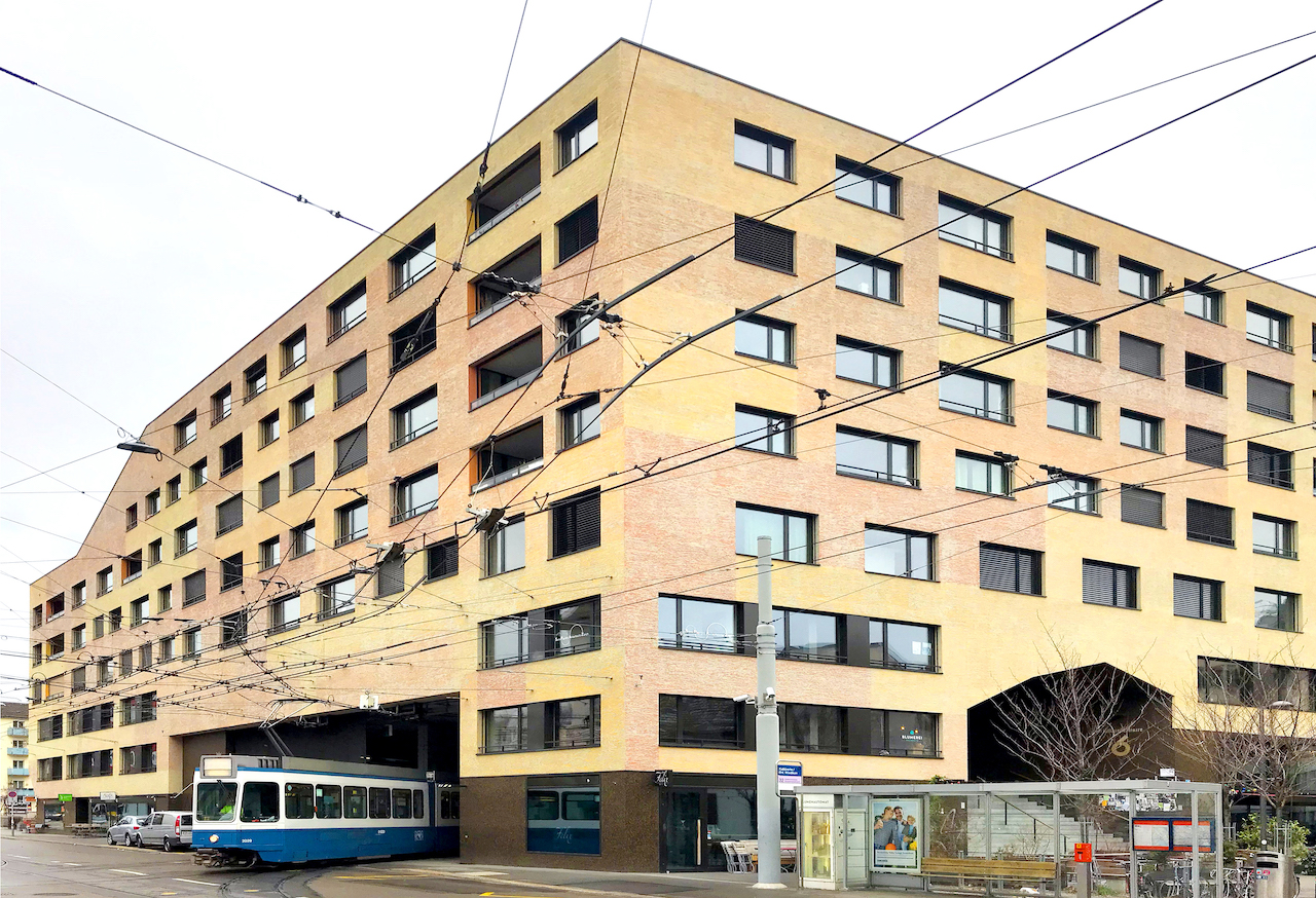 Один из самых интересных с архитектурной и типологической точек зрения жилых кооперативов в Цюрихе – это «Калькбрайте». С 1970-х годов у города существовали планы надстроить треугольную территорию, занятую трамвайным депо в округе 4. Реализовать эту смелую градостроительную идею вызвался кооператив единомышленников и энтузиастов новаторского экологического жилья, созданный в 2007 году. В результате открытого архитектурного конкурса выиграл проект цюрихского бюро «Müller & Sigrist», после чего новый жилой комплекс «поселился» прямо над существующим (и функционирующим) по сей день трамвайным депо.
