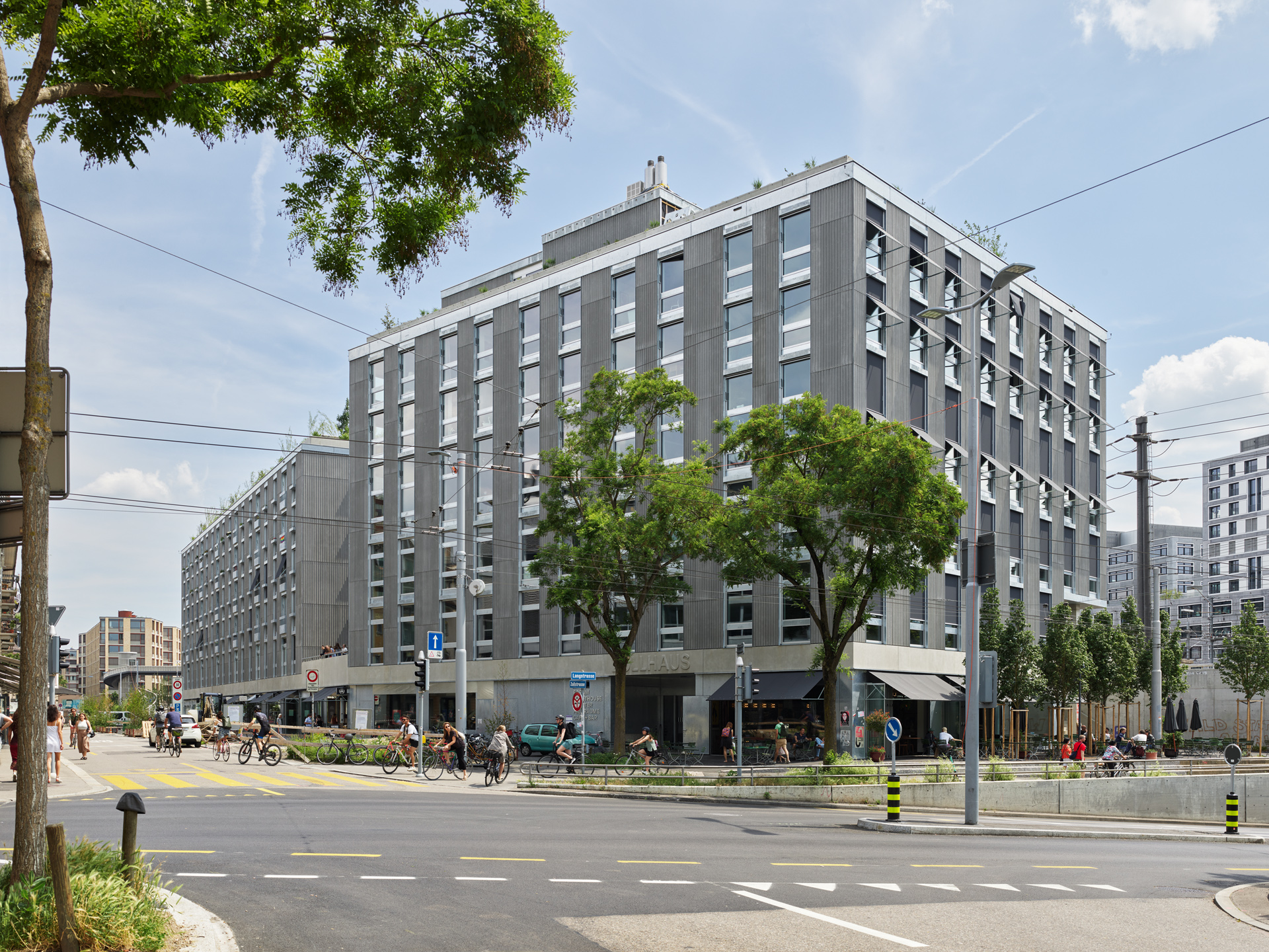 Расположение дома снова, как и в примере с трамвайным депо, – не идеальное, вынужденное. В этот раз кооператив расположился прямо на границе с железнодорожными путями, около главного вокзала, на территории, принадлежавшей SBB. Типологически на своего предшественника Zollhaus совершенно не похож: вместо композиции «бубликом», это – три очень тонких вертикальных пластины. Эстетически тоже: вместо весёлых рыже-жёлтых фасадов ломаной формы, новый комплекс прямо-таки излучает архитектурную скромность – отделка в неброских серо-металлических тонах, суровая сетка фасадов, использование открытого бетона, шифера, сетки рабицы и оцинкованной стали в отделке. В остальном, и самом главном, то есть в принципах социального устройства, разнообразии квартир, отсутствии частного автотранспорта, различных уровнях приватности и коммунальности, экологичном отношении к ресурсам – Zollhaus полностью продолжает концепцию первого кооператива.