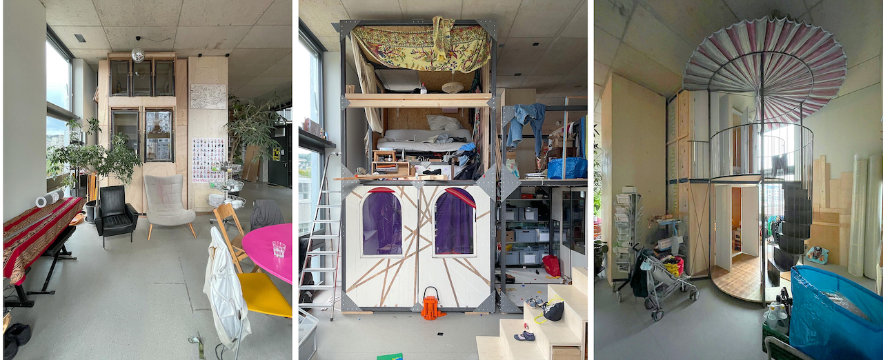 Особенно интересно в Zollhaus устроены так называемые «большие домохозяйства». Вместо стандартной нарезки на квартиры в плане, здесь на этаже высотой в пять метров устроена общая зона площадью в целый этаж. Эта территория принадлежит всем жильцам, а вместо квартир каждому предложено построить себе самостоятельно двухэтажную башню по своему проекту. сё пространство между может использоваться как огромная аморфная гостиная с детскими, обеденными и рабочими зонами, высоченными потолками и панорамными окнами.
