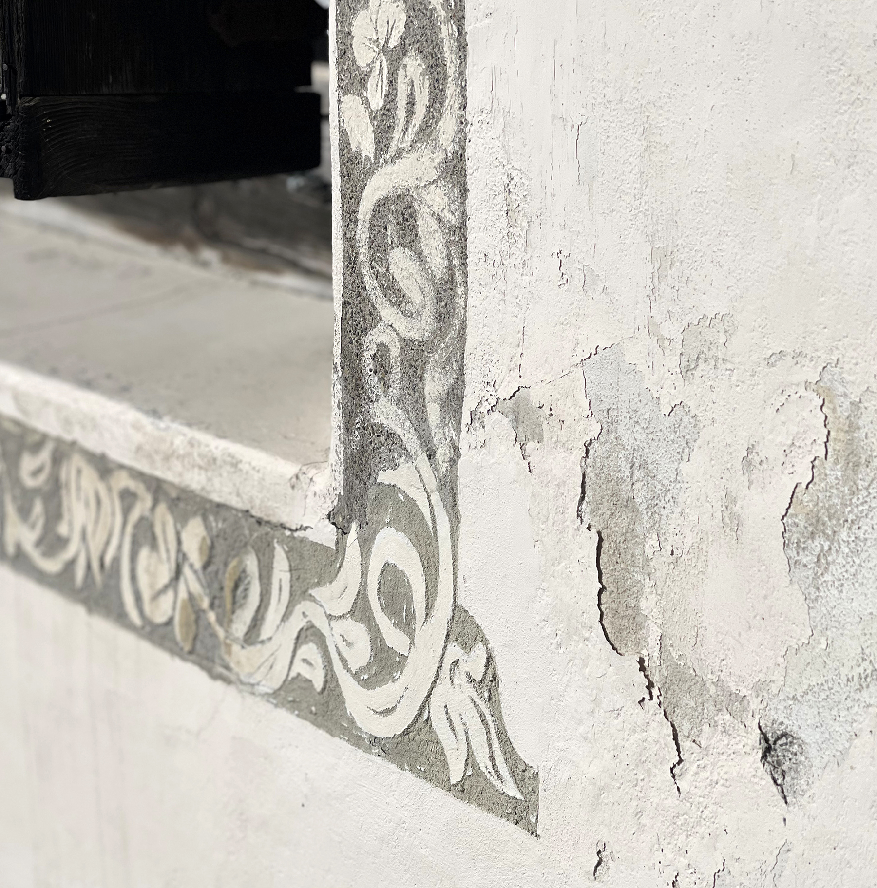 Другой уникальной особенностью деревенских дворцов является техника «сграфитто», применяемая для внешней отделки домов. Сграфитто – это узоры, которые наносятся на стену не добавлением краски на фасад, а наоборот, выскалбливанием или выцарапыванием штукатурки. Основными причинами выбора этой техники стали её долговечность (краска на ветрах и под снегом намного быстрее сотрётся), дешевизна (выскребать дешевле, чем добавлять) и фактурность – из-за рельефности выцарапанные узоры видно и в облачную погоду, и в тумане, и при отсутствии яркого солнца.