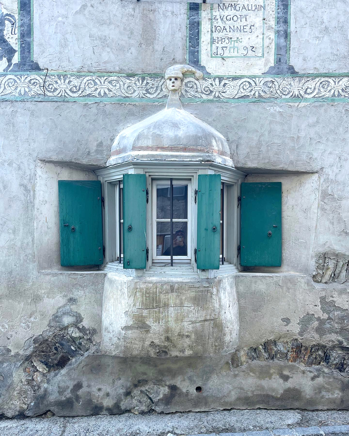Ещё одна особенность энгадинских ферм-дворцов – это эркеры. Будто компенсируя относительную скромность декора домов, эркеры выглядят своего рода авторскими высказываниями хозяев дома, отличительными «наклейками» на фасад.Своеобразность эркеров подчёркивается и их антропоморфностью, ведь каждый из них немного похож на человечка: один – на солдата в униформе, другой – на сонного хозяина в ночной рубашке, третий – на толстого шута в колпаке. Такое богатство форм и типологий, никак не связанных с классической архитектурной традицией, сложно найти в европейском контексте, что делает энгадинские эркеры уникальным историческим артефактом.