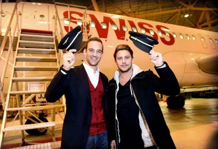 Гости будущей выставки Жоэль Дикер и Бастиан Бейкер на фоне самолета SWISS (swiss.com)