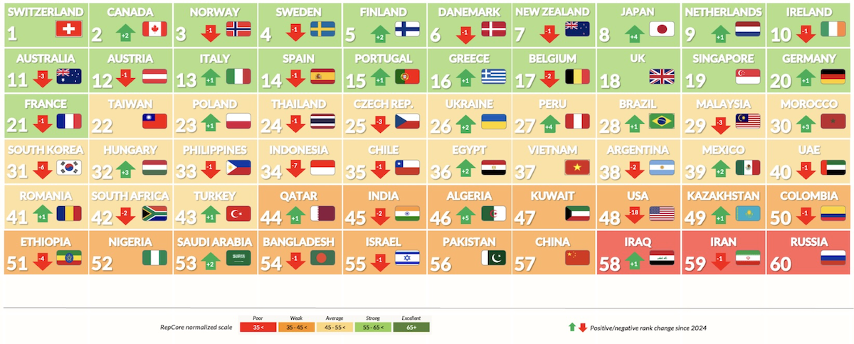 Авторы рейтинга предупреждают о том, что репутацию легко потерять. Страны, репутация которых снижается, теряют международную поддержку, а вместе с ней – влияние, инвесторов и туристов. Примером тому могут служить США, которые перестали восприниматься как надежный партнер. С тех пор как Дональд Трамп во второй раз стал президентом, США потеряли 18 позиций, опустившись в рейтинге с 30-го на 48-е место. Наиболее сильно пострадали такие аспекты репутации США, как приверженность международному сообществу, борьба с изменением климата, благоприятная деловая среда и… уважаемые лидеры.