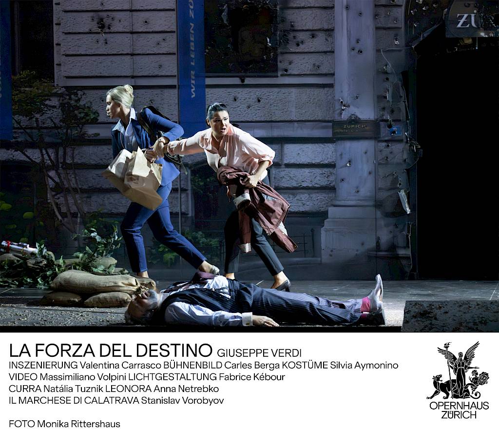 L'auteure de la mise en scène, la réalisatrice argentine Valentina Carrasco, a collaboré de 2000 à 2020 avec la troupe de théâtre catalane La Fura dels Baus, connue pour ses scénographies inattendues et l'effacement des frontières entre artistes et public. Elle a en outre participé à de nombreuses productions d'opéra – notamment à la mise en scène de Don Giovanni de Mozart à Perm (Russie), et d’Aleko et de Francesca da Rimini de Rachmaninov à Kiel (Allemagne). Dans un court entretien publié sur le site web de l'Opéra de Zurich, Valentina Carrasco explique que ce qui compte le plus pour elle dans La Forza des destino, c'est la présence constante de la guerre dans le destin des personnages principaux. La metteuse en scène n'a pas exagéré : la guerre est effectivement omniprésente, même lorsque – selon le livret – elle ne devrait pas être visible sur scène. Ainsi, dans la scène où Leonora arrive au couvent, non seulement ont lui coupe les cheveux, mais on lui fait aussi un tatouage sur le bras, on lui fait enfiler un gilet pare-balles et on lui remet un fusil automatique dans les mains. Une partie du public a peut-être trouvé ces détails un peu trop gros, ce qui explique le « Boo » distinct qui a retenti dans la salle lorsque l’équipe assument la régie est sortie pour saluer à la fin du spectacle ; en revanche, tous les solistes – qui ne le méritaient pas tous de la même manière –, de même que le chœur et le chef d'orchestre Gianandrea Noseda, ont été accueillis par des applaudissements enthousiastes, qui se sont transformés en ovation.