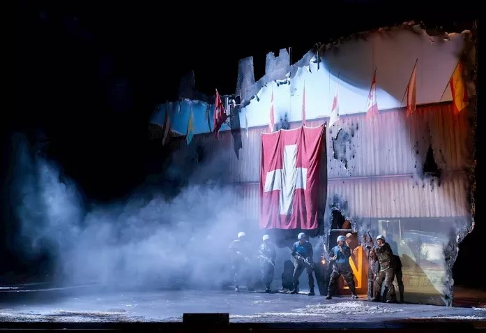 En s'attaquant à La forza del destino à Zurich, Valentina Carrasco a décidé de faire un choix intéressant, voire audacieux : transposer l'action non pas dans un pays fictif en guerre, mais concrètement dans la Suisse neutre. Sur fond d'une magnifique ouverture et de son célèbre thème du destin, le spectateur peut voir sur un écran géant une carte de Suisse flanquée d’une route nocturne mal éclairée qui semble la traverser, et que bordent de maisons détruites. Où mène cette route ? Elle mène à la guerre.