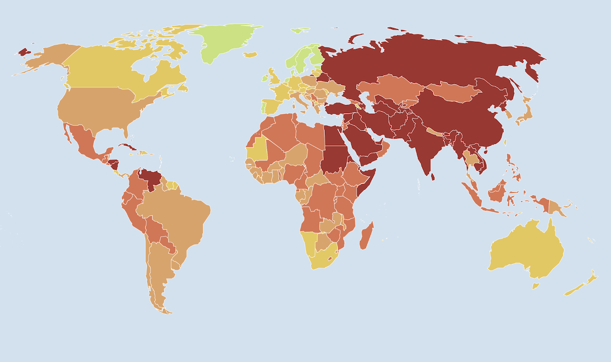 Чем краснее цвет, тем ниже позиция страны в рейтинге свободы прессы (с) RSF