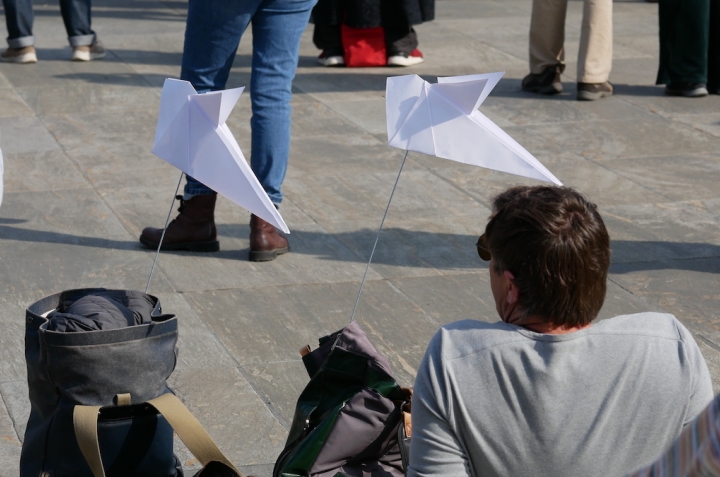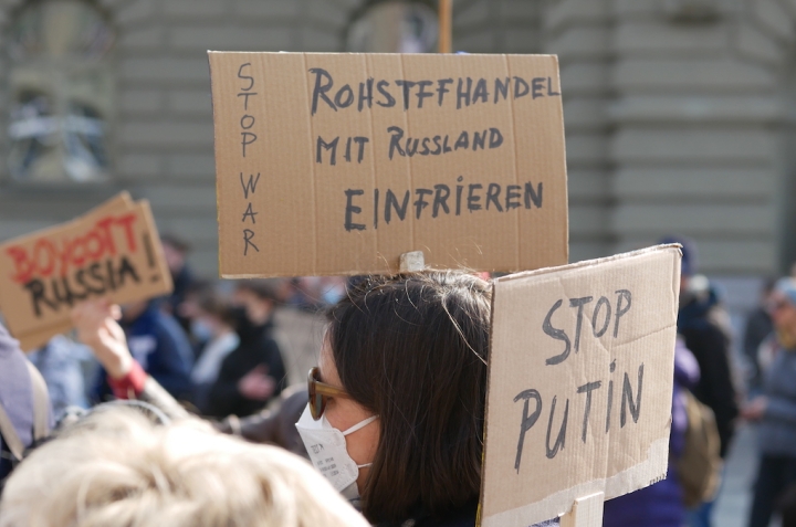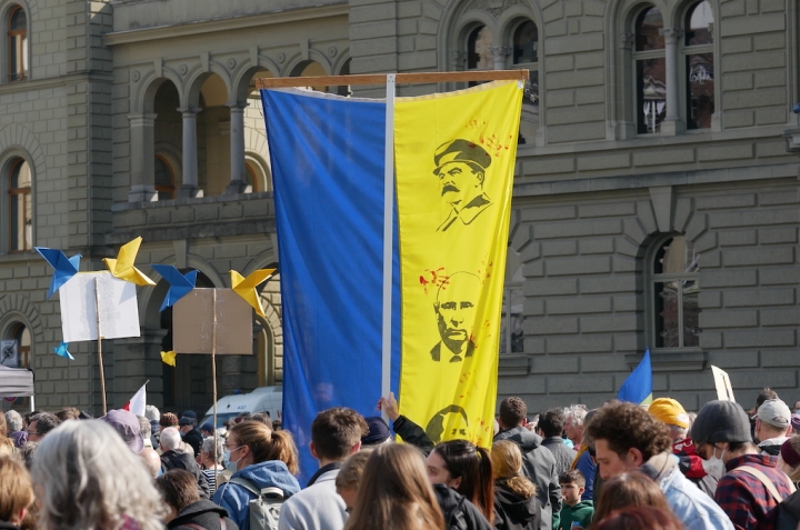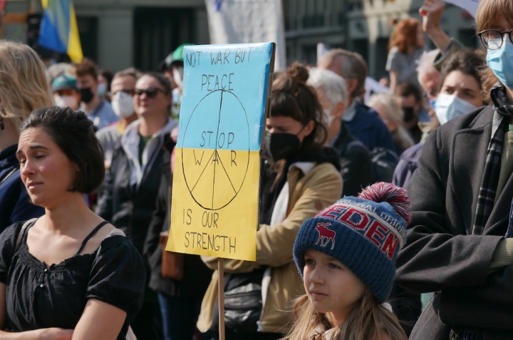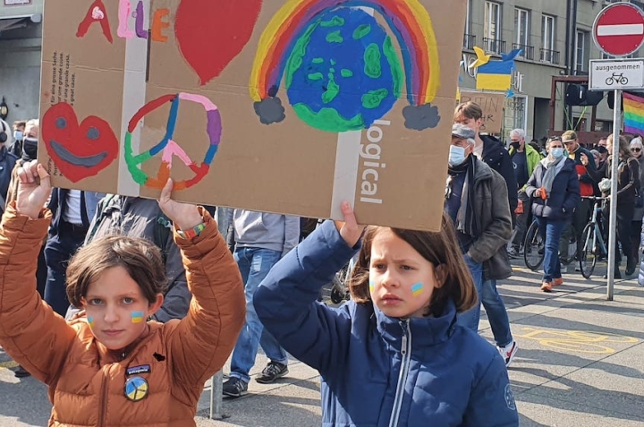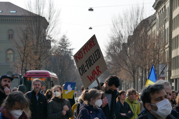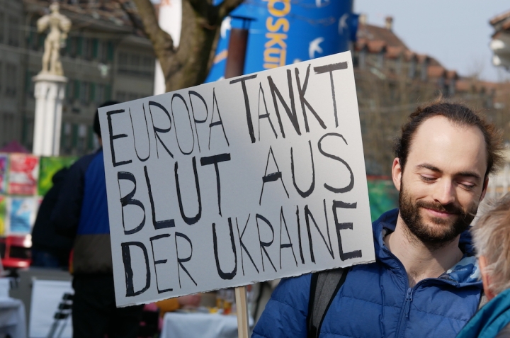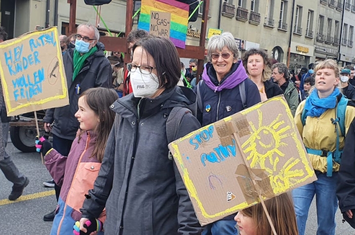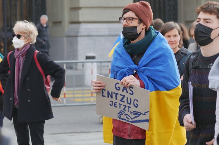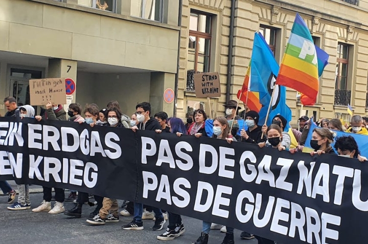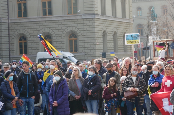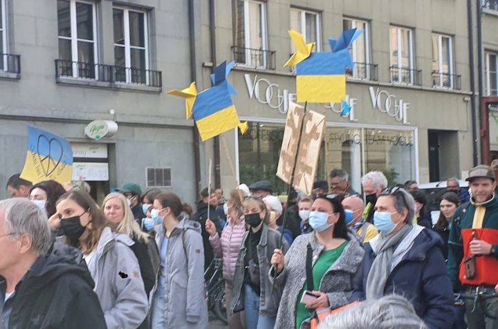 В субботу, 12 марта, в Берне несколько тысяч человек приняли участие в митинге за установление мира в Украине и за запрет импорта российского природного газа в Швейцарию. Протестующие прошли колонной от Schützenmatte до Федерального дворца. Многие несли в руках украинские флаги, радужные флаги мира, самодельных бумажных голубей и плакаты с критикой в адрес российского президента. Проведение акции было одобрено городскими властями. Нажмите на фото, чтобы увидеть его целиком. Фото – (с) Nashagazeta.ch; участники акции.