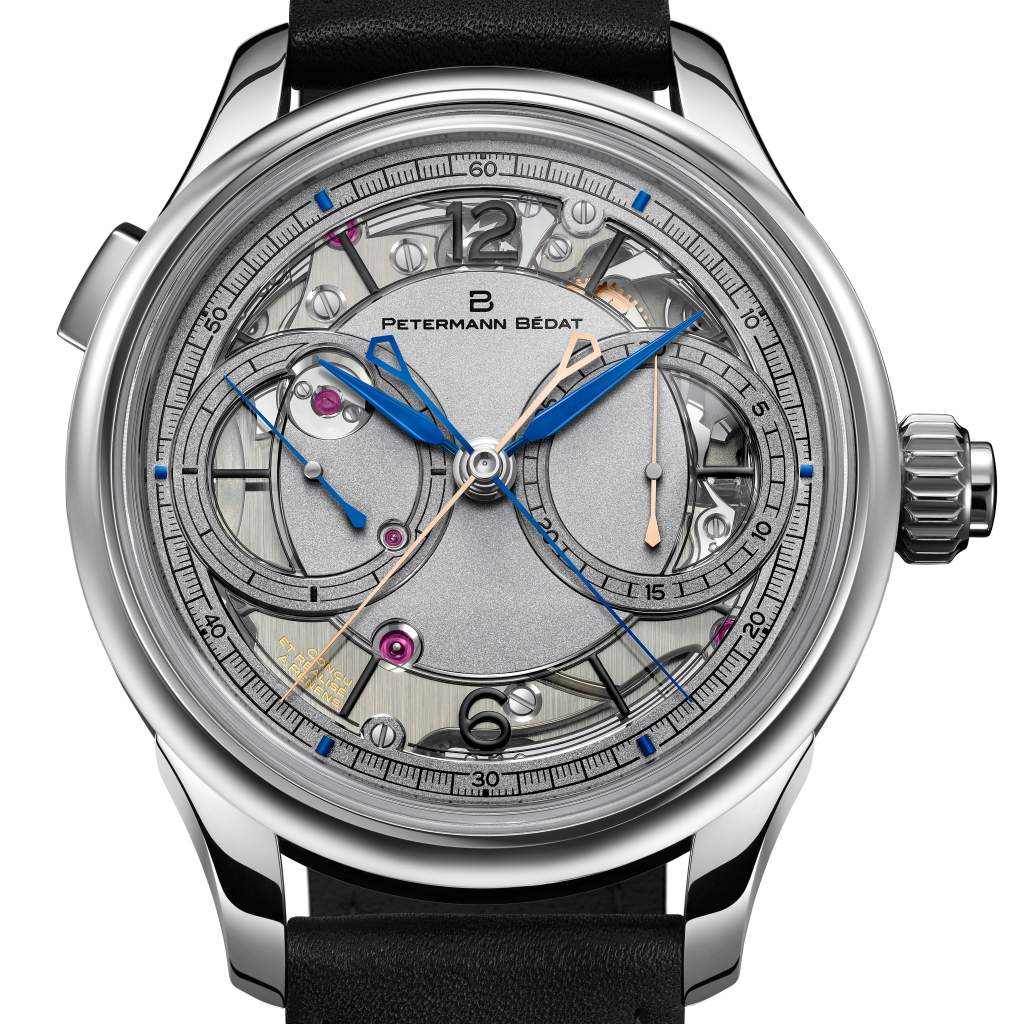 Механические часы,имеющие индикациюхронографа, допускаютсяк конкурсу и с дополнительными усложнениями. Наибольшее впечатление произвела на жюри модельChronographe rattrapante бренда Petermann Bédat.