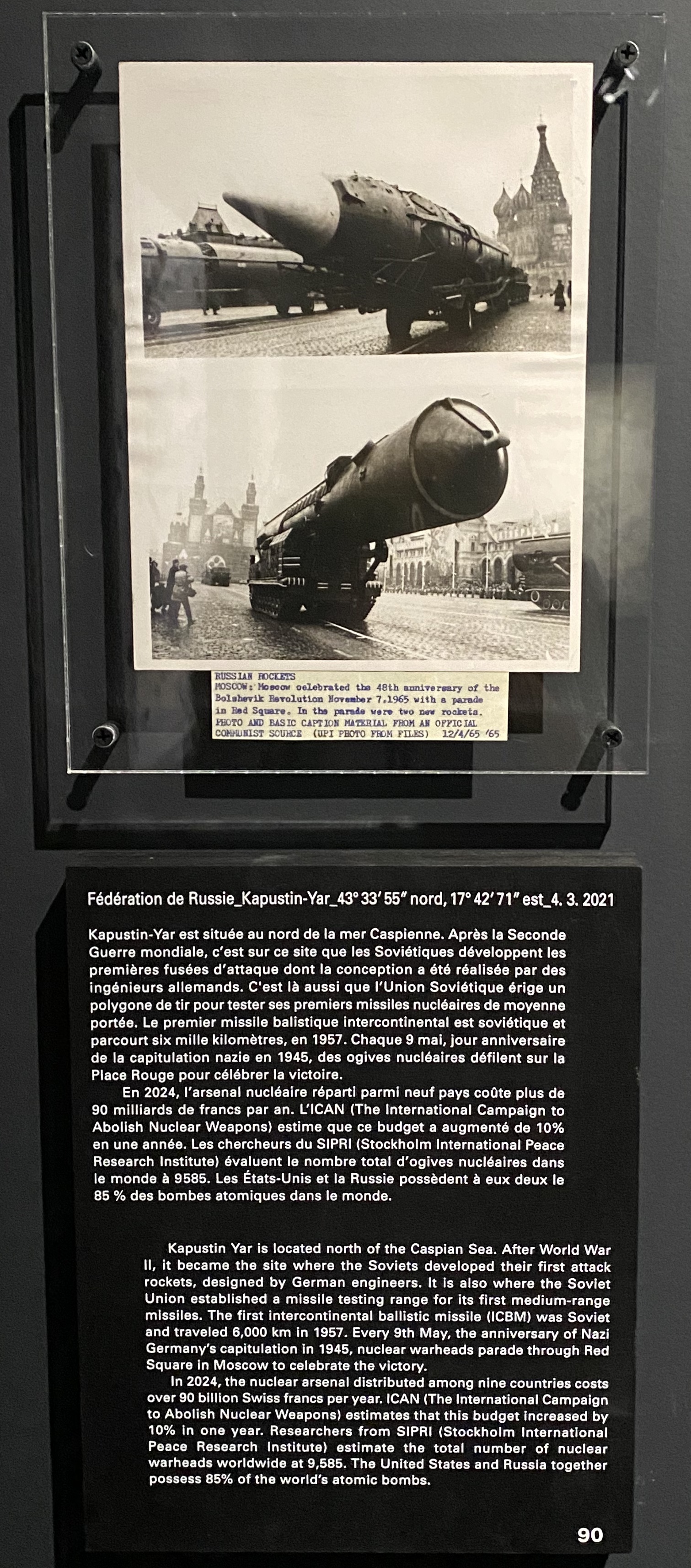 Как всегда, мы искали на этой экспозиции «наши» следы. И нашли. В зале под названием «Ионизированные топографии», где 13 уникальных фотографий представляют визуальную археологию погребенных следов невидимой радиоактивности, следов ядерных испытаний и катастроф, имевших место в «мирное время». Обратите внимание: верхняя и нижняя части каждого изображения изогнуты, чтобы создать ощущение точки схода этих пейзажей небытия, по-своему парадоксально красивых. Они сопровождаются фактами и документами того времени, чтобы напомнить, что земля, увиденная с неба, также показывает шрамы, нанесенные ей человеком. Пример: в апреле и июне 1951 года в Дезерт-Рок 7350 американских солдат без какой-либо защиты участвовали в четырех ядерных испытаниях, целью которых было изучение воздействия атомной атаки на войска...