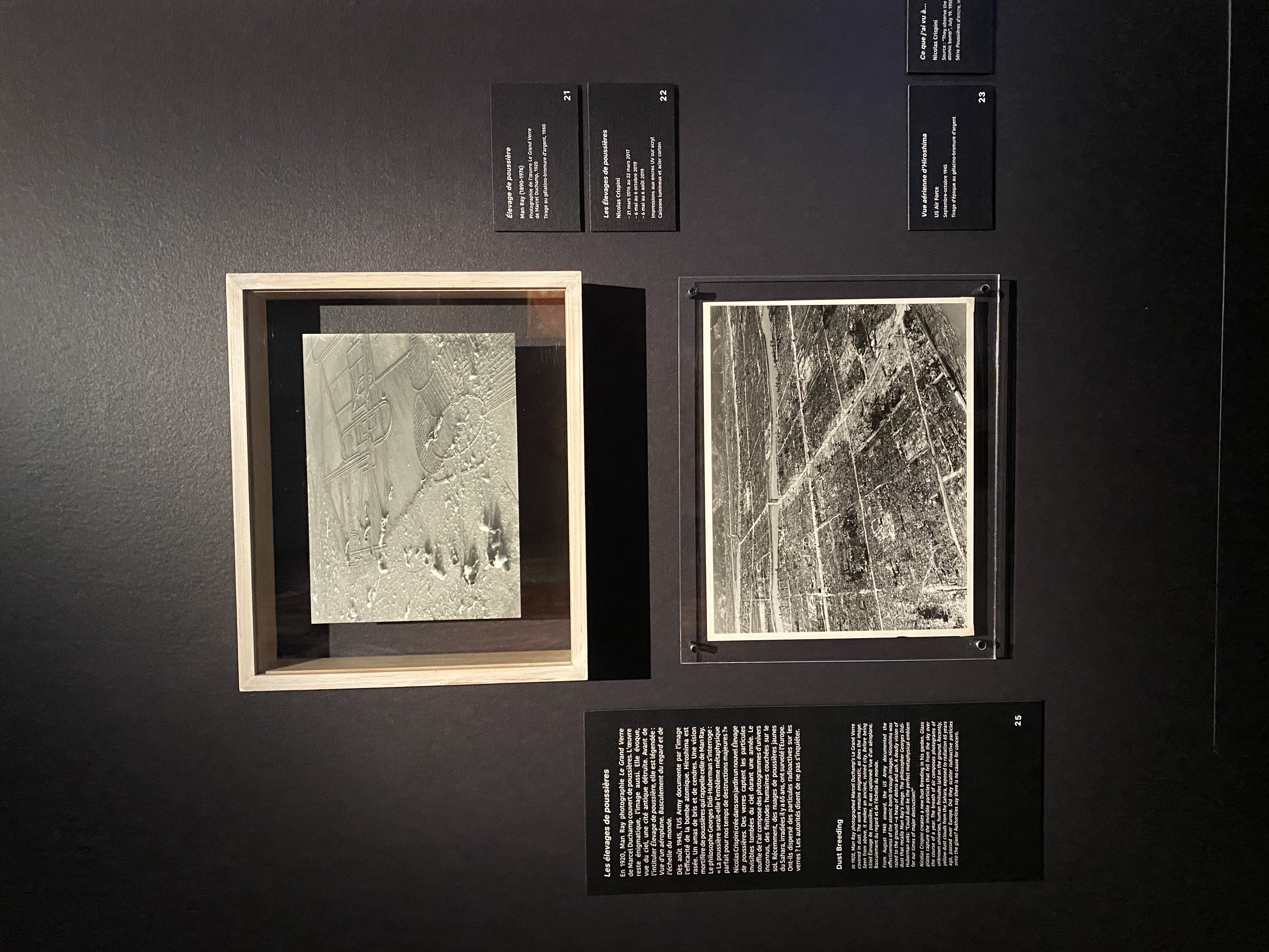 Рядом со снимками советских ракет удивительная инсталляция Николя Криспини как бы воспроизводит знаменитую работу Мэн Рея, в 1920 году сфотографировавшего Фотография эта остается не растолкованной, но напоминает она видимый сверху разрушенный древний город, а до того, как войти в историю фотографии под названием «Разведение пыли», она была подписана так: «Вид с борта аэроплана. Сдвиг взгляда и шкалы мира». Сдвиг.