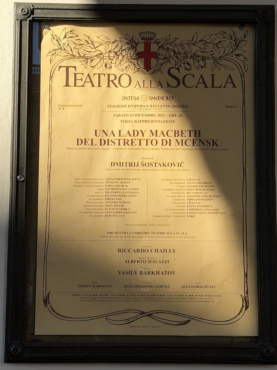 «В этом году сезон откроется оперой Дмитрия Шостаковича «Леди Макбет Мценского уезда» – произведением спорным, чувственным и революционным, долгое время подвергавшимся цензуре за свою смелость и сегодня признанным шедевром музыки XX века». Такой была формулировка итальянского телеканала RAI, 7 декабря транслировавшего из Милана премьеру спектакля, которым завершается календарный музыкальный год, прошедший под знаком 50-летия со дня смерти Дмитрия Дмитриевича Шостаковича.