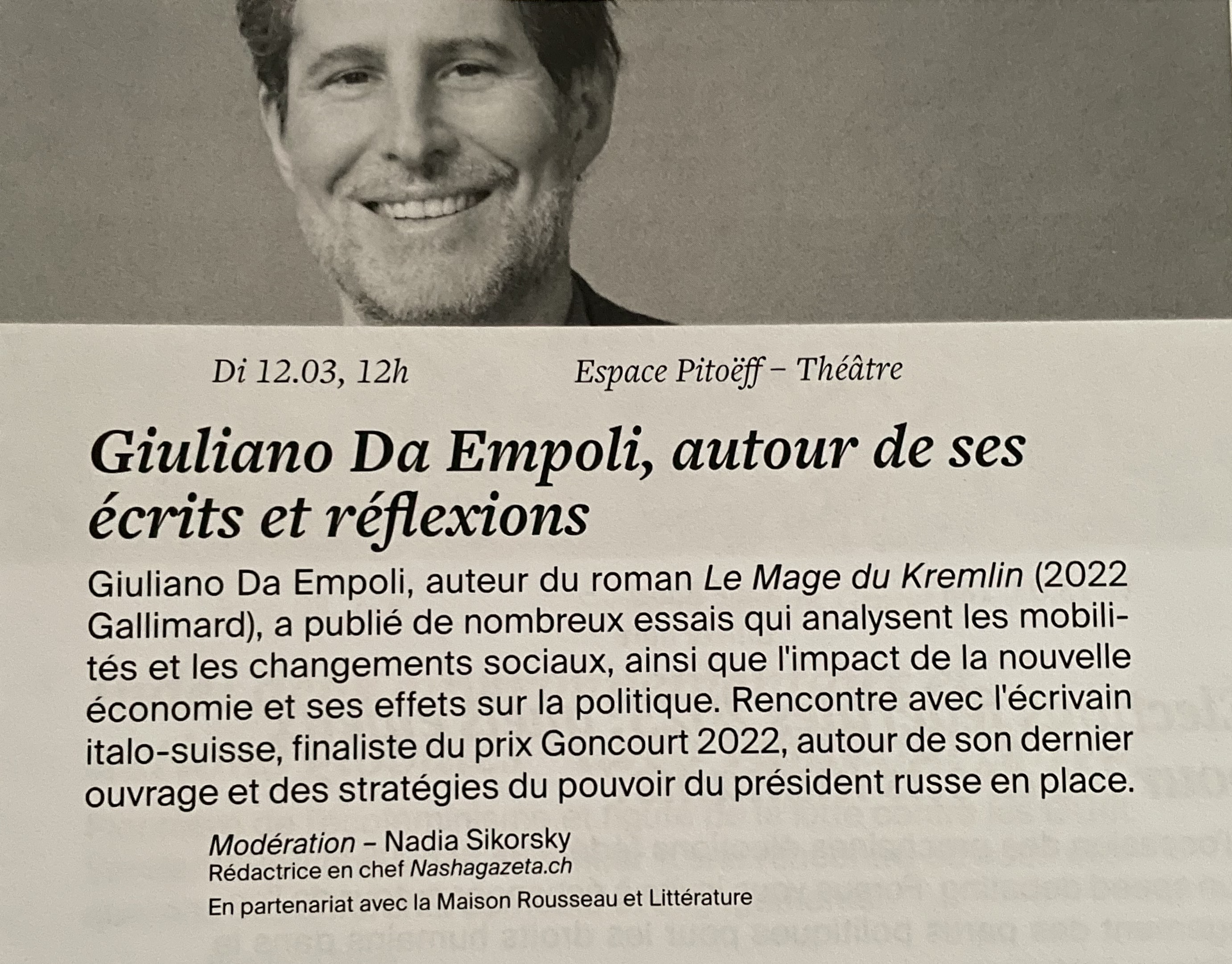 Там же, в Театре Питоеффа, названного так в честь Георгия Ивановича Питоева, о котором мы уже рассказывали, 12 марта в 12 ч. состоится встреча с писателем Джулиано Да Эмполи, автором нашумевшего романа «Кремлевский волшебник». Вести беседу приглашена главный редактор Нашей Газеты Надежда Сикорская, уже встречавшаяся с этим гостем.