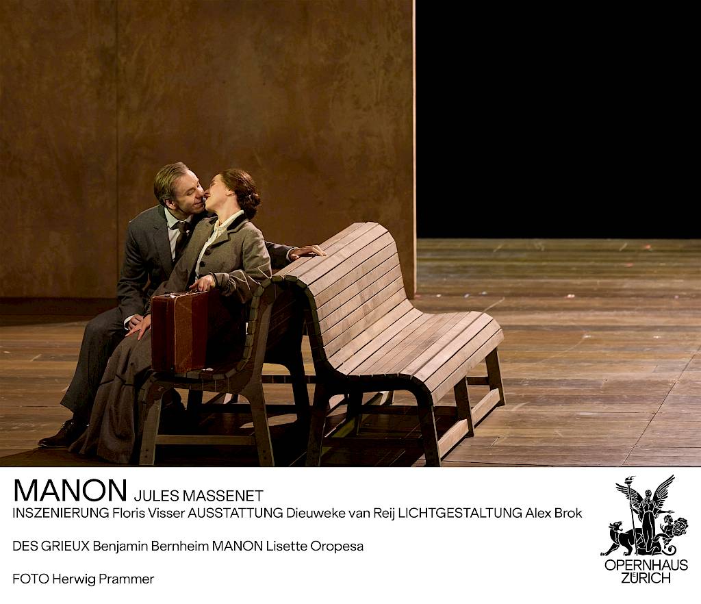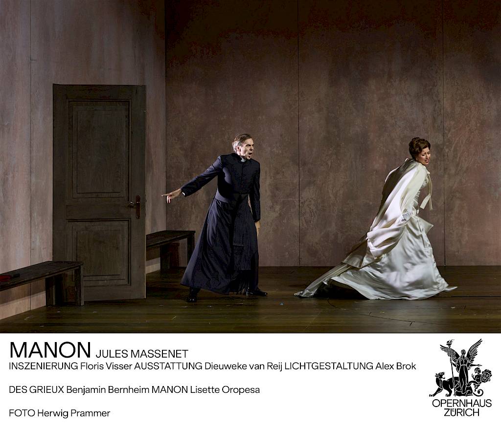 Очевидно, что именно на доставление удовольствия публике и направлены прежде всего творческие, интеллектуальные и, надо полагать, финансовые ресурсы Цюрихской оперы. Что главное для успеха оперного спектакля? Отличные певцы. А они стоят дорого, даже если стоят того. Чтобы заполучить их, да еще по несколько звезд на спектакль, надо – и стоит! – сэкономить на чем-то другом. Например, на декорациях. В обоих постановках их – минимум, они просты, но качественны и точны. В «Манон», например, достаточно стилизованной скамейки, на которой Манон/Соня Йончева поет арию «Voyons, Manon, plus de chimères», чтобы любой бывавший во Франции человек ощутил себя на традиционном провинциальном вокзале, или пары столиков – для создания характерной атмосферы бистро. Во втором действии слушатель проникается такой же симпатией к простому обеденному столу, которому посвящена ария Манон «Adieu, notre petite table», как и к «дорогому, многоуважаемому шкафу» из «Вишневого сада», со знаменитым монологом Гаева. Оба эти предмета мебели напоминают героям о счастливых моментах их жизни. А разве требуется что-то помимо распятия на стене и статуи Мадонны для создания аскетической атмосферы семинарии Сен-Сюльпис? Нет, ничего не требуется. Как не требуется ничего, кроме большой хрустальной люстры и элегантных туалетов, чтобы зритель перенесся в светский салон.