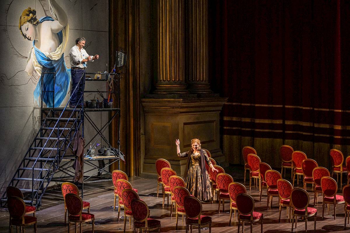 Аналогичная ситуация в постановке «Тоски», сценографическое решение которой нам очень понравилось. С левой стороны сцены – часовня, на стене которой Марио Каварадосси пишет портрет красавицы, вызвавший ревность его возлюбленной, справа – закрытый театральный занавес, намекающий на присутствие за ним сцены: Флория Тоска – певица. Так на сцене объединены миры главных героев, а зрительские кресла посередине, «подходящие» и для церкви, и для театра, напоминают, что вся наша жизнь – театр! Просто, ненавязчиво, элегантно. По законам жанра, согласно которым присутствующее на сцене ружье обязательно должно выстрелить, закрытый занавес на сцене должен был открыться. И он открылся, предъявив взорам восхищенных зрителей зал, где священнослужители в роскошных одеяниях прославляют восседающую на троне-алтаре Флорию Тоску, олицетворение Любви.