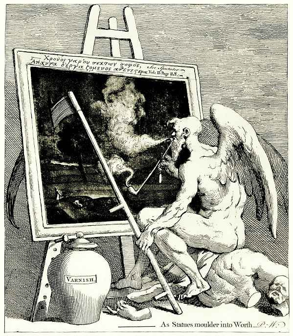 Четыре мастера, чьи работы представлены в этом разделе выставки, сначала полностью делали пластину шероховатой, чтобы она давала абсолютно чёрный оттиск. Потом выглаживали участки, где нужны светлые тона. В результате получались плавные переходы от чёрного к светлому – словно мягкая бархатная тень. Очень понравилась нам в этом разделе работа Уильяма Хогарта 1761 года «Время, окуривающее картину» – при полном попустительстве службы пожарной безопасности.