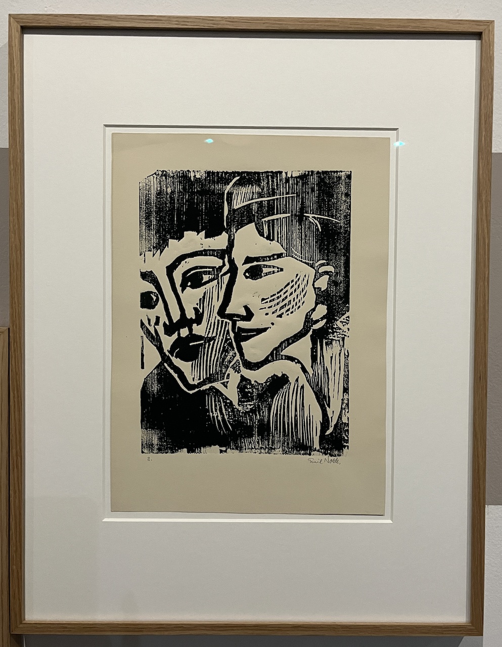 Речь идет о гравюра на дереве. Как она рождается? Художник вырезает изображение на дощечке: всё, что остаётся выступающим, печатается. Очень графично, контрастно, часто с грубоватой фактурой дерева. Тут вас сразу ошарашивает «Уличная сцена» (1922) Эрнста Людвига Киршнера, соседство которой с Дюрером, Гогеном, Валлотоном, Мюнком и Нольде и прочими воспринимается уже вполне естественно.