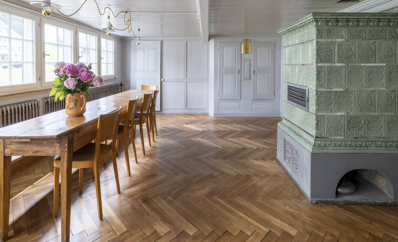 Господский дом, построенный в начале 18 века в городе Хундвиль в кантоне Аппенцелль-Аусерроден, был тщательно отреставрирован в рамках арт-проекта, направленного на теоретическое и практическое исследование оригинальных материалов. Этот 15-комнатный дом с островерхой крышей расположен в городском ландшафте национального значения, на бывшей площади Landsgemeindeplatz, вблизи от церкви Грубенманна. За прошедшие столетия здесь размещалась ткацкая мастерская, магазин тканей, рестораны, антикварные магазины… Все это вкупе с солидным возрастом оставило следы, и для того, чтобы дом стал обитаемым, необходимо было пойти на компромиссы. Проведенные работы – пример бережного отношения к строительному наследию. «Улучшения» 1950-х и 1990-х годов были частично разобраны, а новые реставрационные работы проведены со знанием изначально использованных материалов и способов их обработки: особых очистительных средств, льняного масла, пигментов, резины, пшеничной пасты, воска…