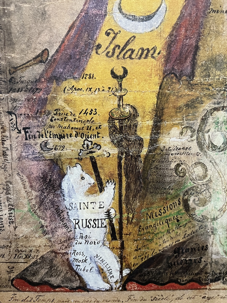 Художники-самоучки не были людьми публичными, так что их творчество – настоящее открытие. А вот открытие совсем иного рода – присутствие среди них Анри Дюнана (1828-1910). Да-да, того самого – основавшего движения Красного Креста и ставшего первым обладателем Нобелевской Премии мира, в 1901 году. Мало кто знает, что в конце жизни он добровольно уединился в городке Хайдене в кантоне Аппенцелль, где и прожил 25 лет, до самой смерти. Именно в тот период, а точнее между 1877 и 1890 годами, он создал серию из четырех диаграмм, которые подписал «швейцарский христианин» и которые были обнаружены лишь после его смерти аккуратно сложенными, судя по всему, им самим. Сегодня они хранятся в собрании женевского Музея Красного Креста, который предоставил факсимиле двух из них Музею Реформации. В этих картинах-диаграммах огромное количество деталей, которые очень интересно внимательно рассматривать, особенно кусочек России с белым медведем. Главная же мысль создателя первой в мире гуманитарной организации совершенно очевидна – Апокалипсис близок.