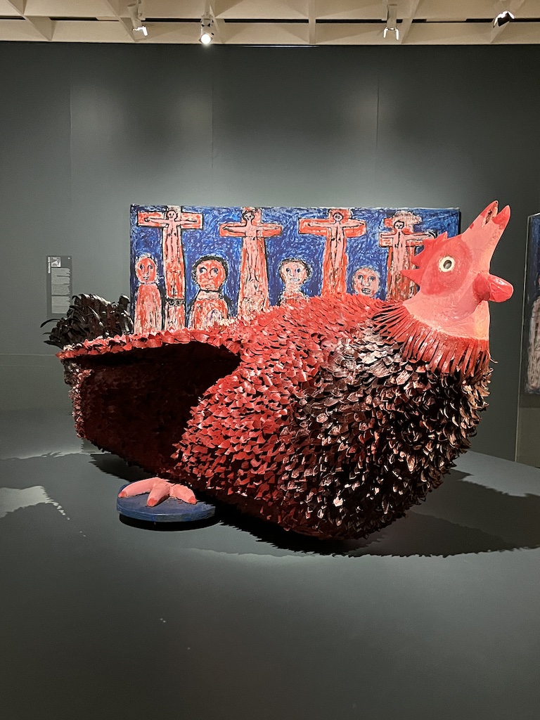 Каждый из представленных артистов по-своему интересен, но дольше всего посетители задерживаются в зале, где выставлены работы жившего в Гане человека по имени Атаа Око, который выбрал в качестве главной темы своего творчества… гроб. Гробы он придумывал на все вкусы, и, глядя на выставленный в центре зала гроб-петух, невольно задумываешься…