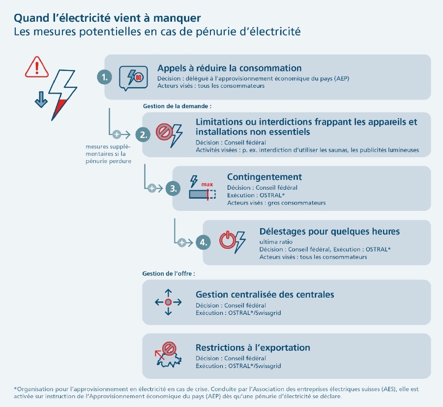 Чтобы справиться с этой исключительной ситуацией, Федеральный совет, кантоны, профильные ведомства, федеральная комиссия по электроэнергии, а также представители электроэнергетической и газовой отраслей уже некоторое время работают в тесном сотрудничестве. Они разработали различные меры для создания резервов, снижения зависимости от нефти и газа и укрепления местных возобновляемых источников энергии.