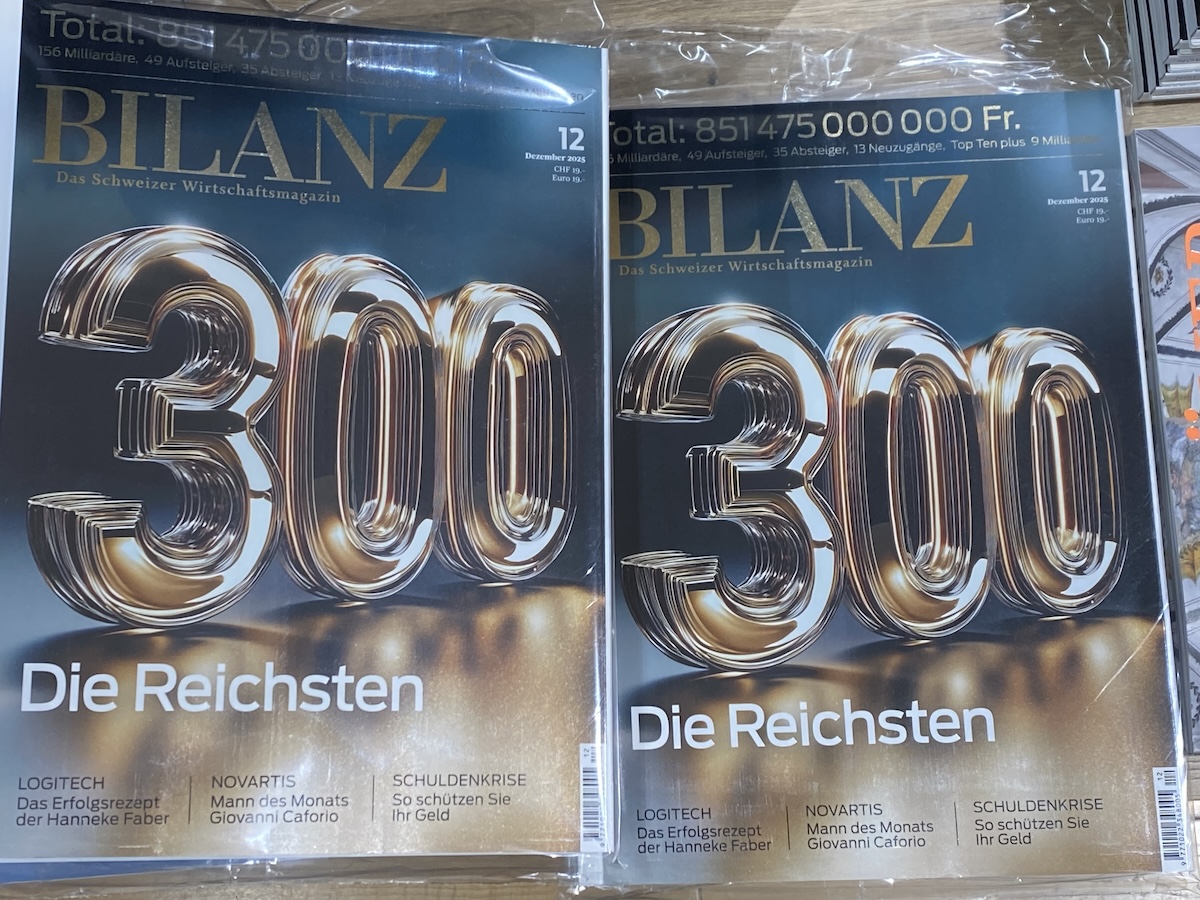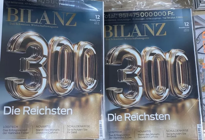 Каждый год в конце ноября экономический журнал Bilan публикует список 300 самых богатых людей Швейцарии. Их совокупное состояние увеличилось за год до 851,5 млрд франков, что соответствует росту в размере 2,2% – это больше, чем экономический рост, но меньше, чем показатели швейцарской биржи SMI.