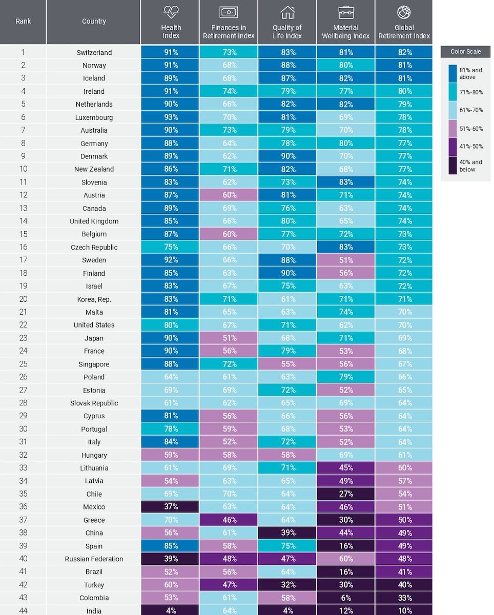 Глобальный пенсионный индекс (GRI) составляется с 2012 года французской компанией Natixis Investment Managers, специализирующейся на управлении активами. В исследовании рассматривались 44 страны с развитой экономикой, входящие в Международный валютный фонд (МВФ), Организацию экономического сотрудничества и развития (ОЭСР) и БРИК. Каждая страна получила средний балл по четырем категориям (финансовое положение пенсионеров, материальное благополучие, качество жизни, система здравоохранения) и заняла определенное место в зависимости от полученных пунктов.